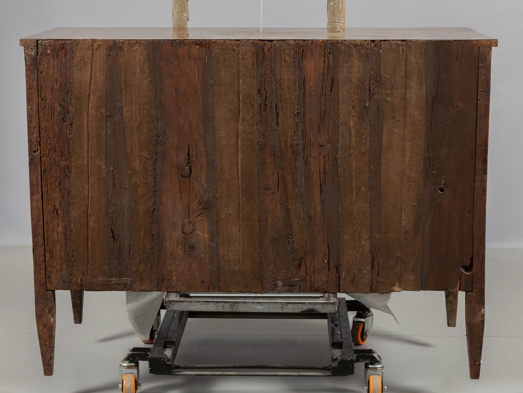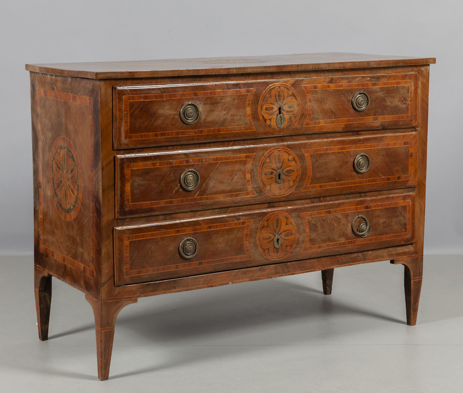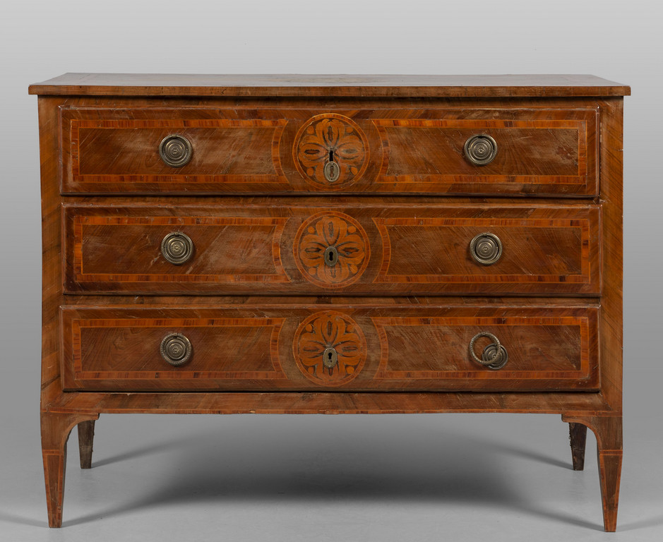 Comò Luigi XVI a tre cassetti in noce lastronato ed intarsiato con medaglione centrale e filetti in bois de rose ripetuti anche sui fianchi, piano in legno, Piemonte II metà sec.XVIII