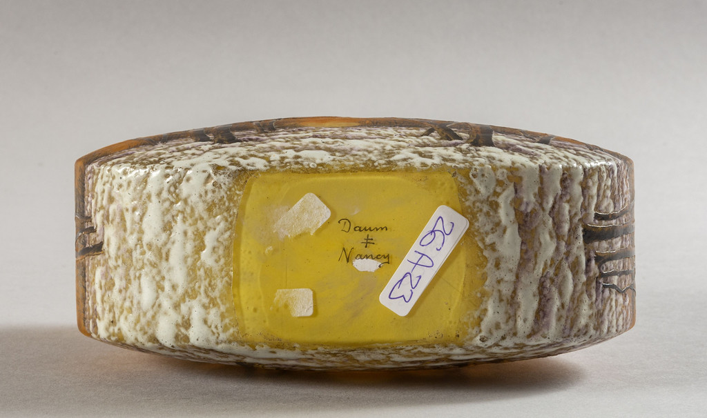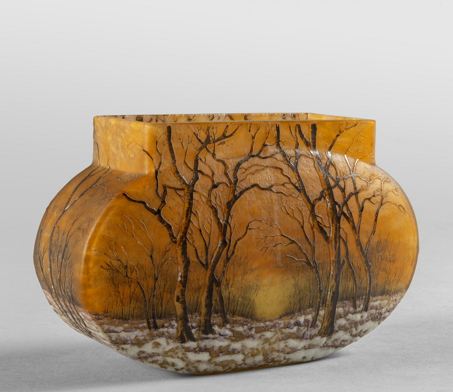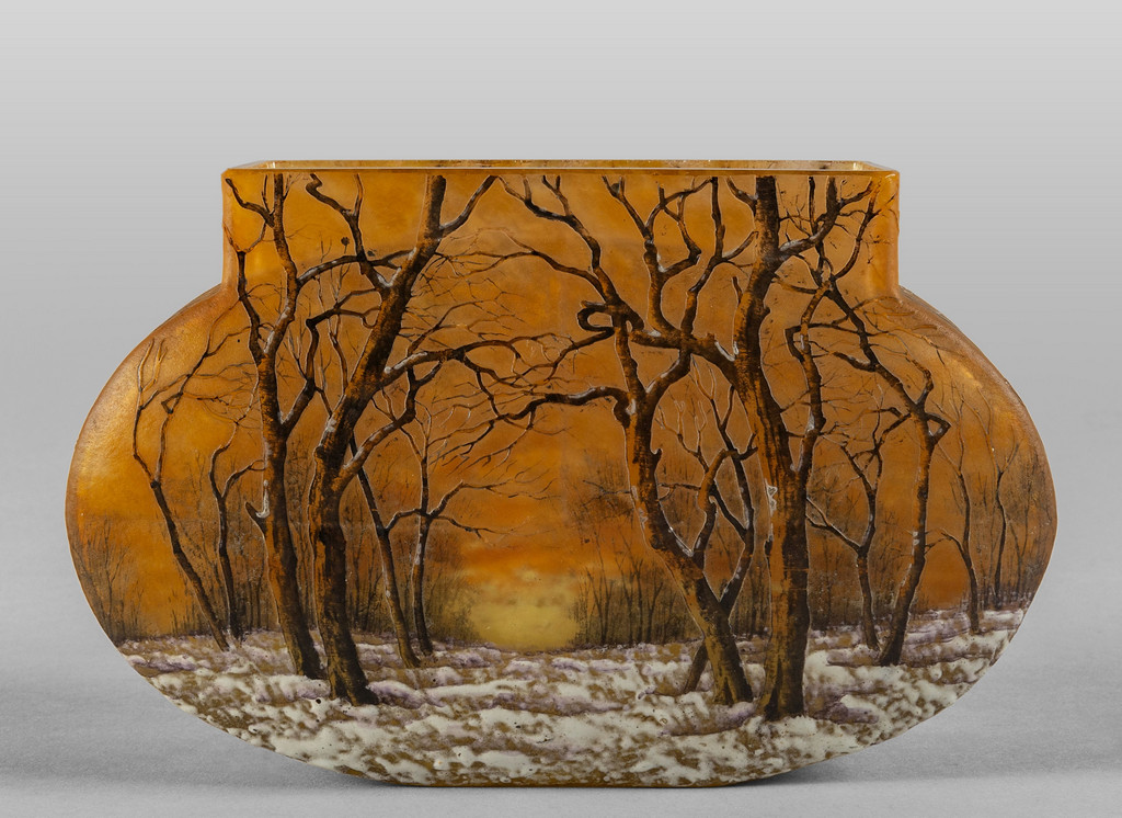 Vaso in vetro lavorato all'acido raffigurante un boschetto innevato, f.to Daum Nancy alla base