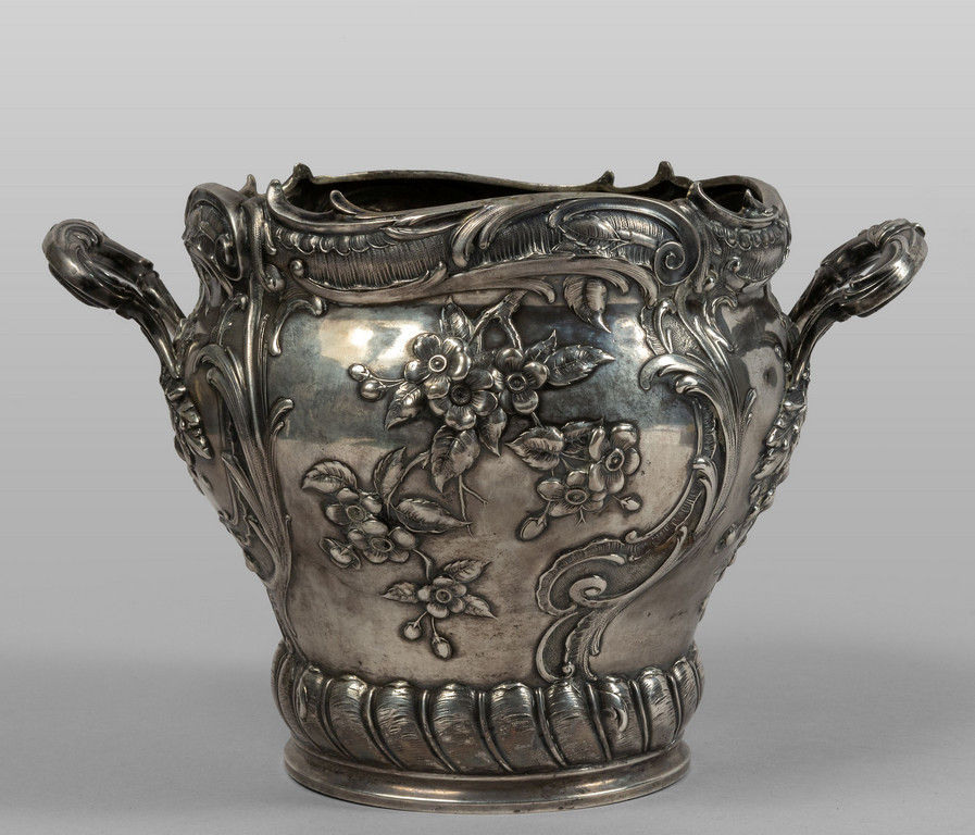Secchiello in argento con manici, riccamente sbalzato a fiori