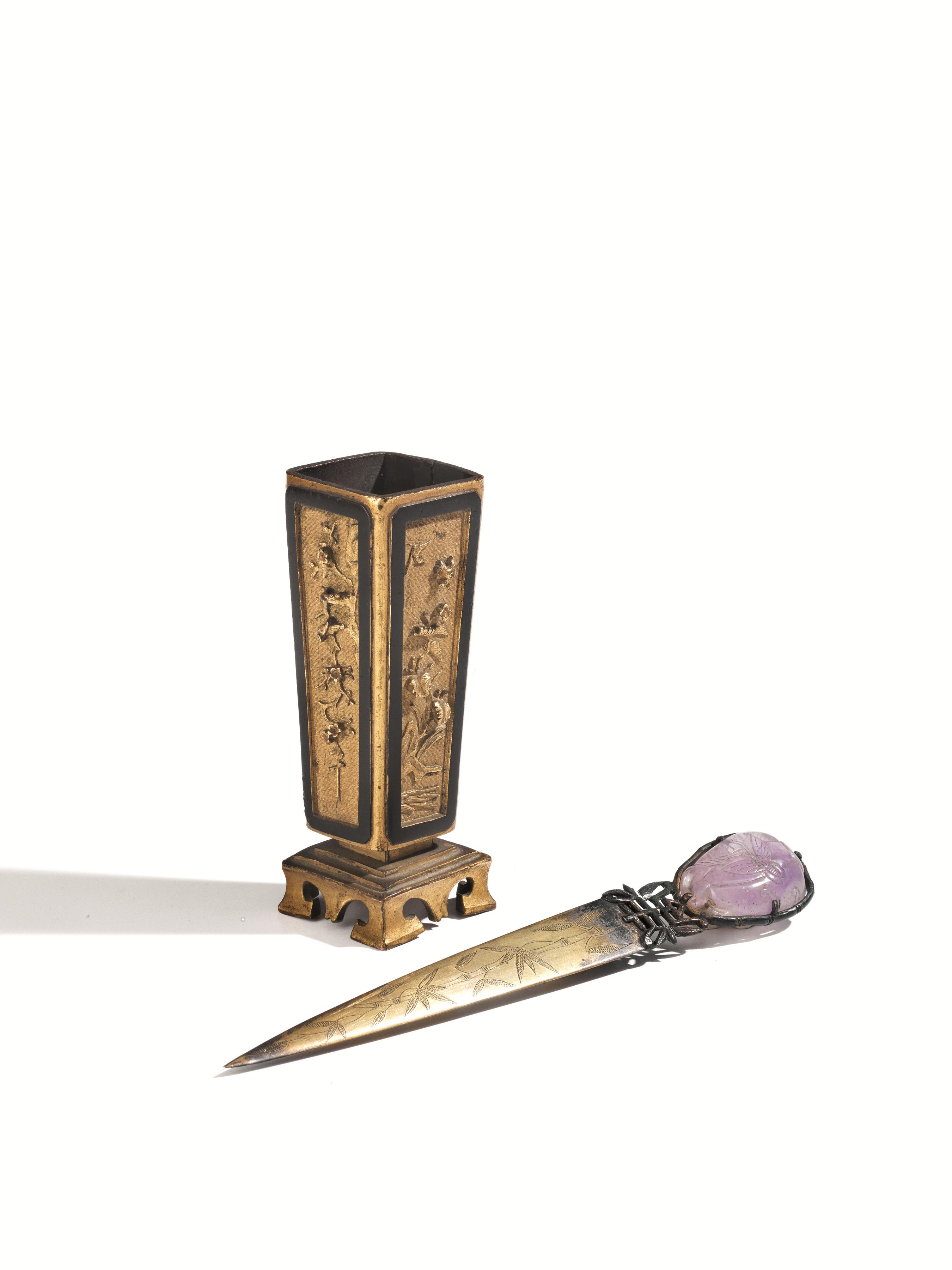 Tagliacarte, Cina inizi XX sec, in ottone e ametista, la lama incisa a ramo di bamboo, l'ametista finemente intagliata, lung. cm 19