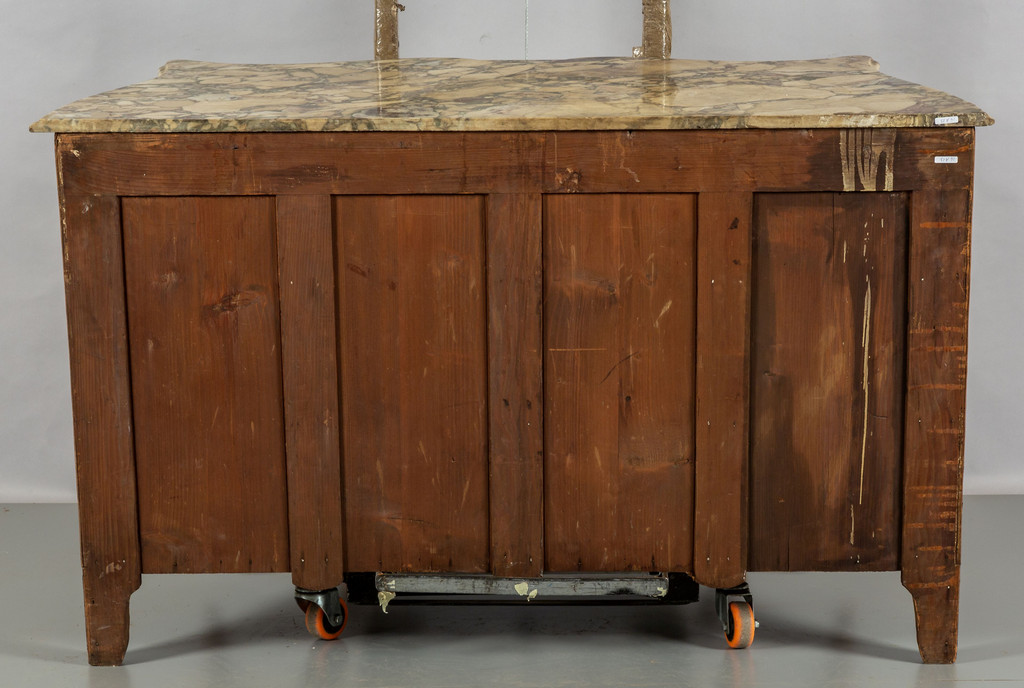 Comò in stile Luigi XIV a tre cassetti lastronato in palissandro, piano in marmo, maniglie in bronzo dorato, Francia fine sec.XIX