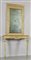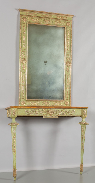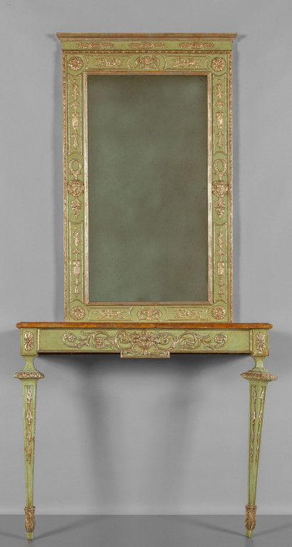 Console con specchiera in stile Luigi XVI in legno intagliato e laccato, metà sec.XX