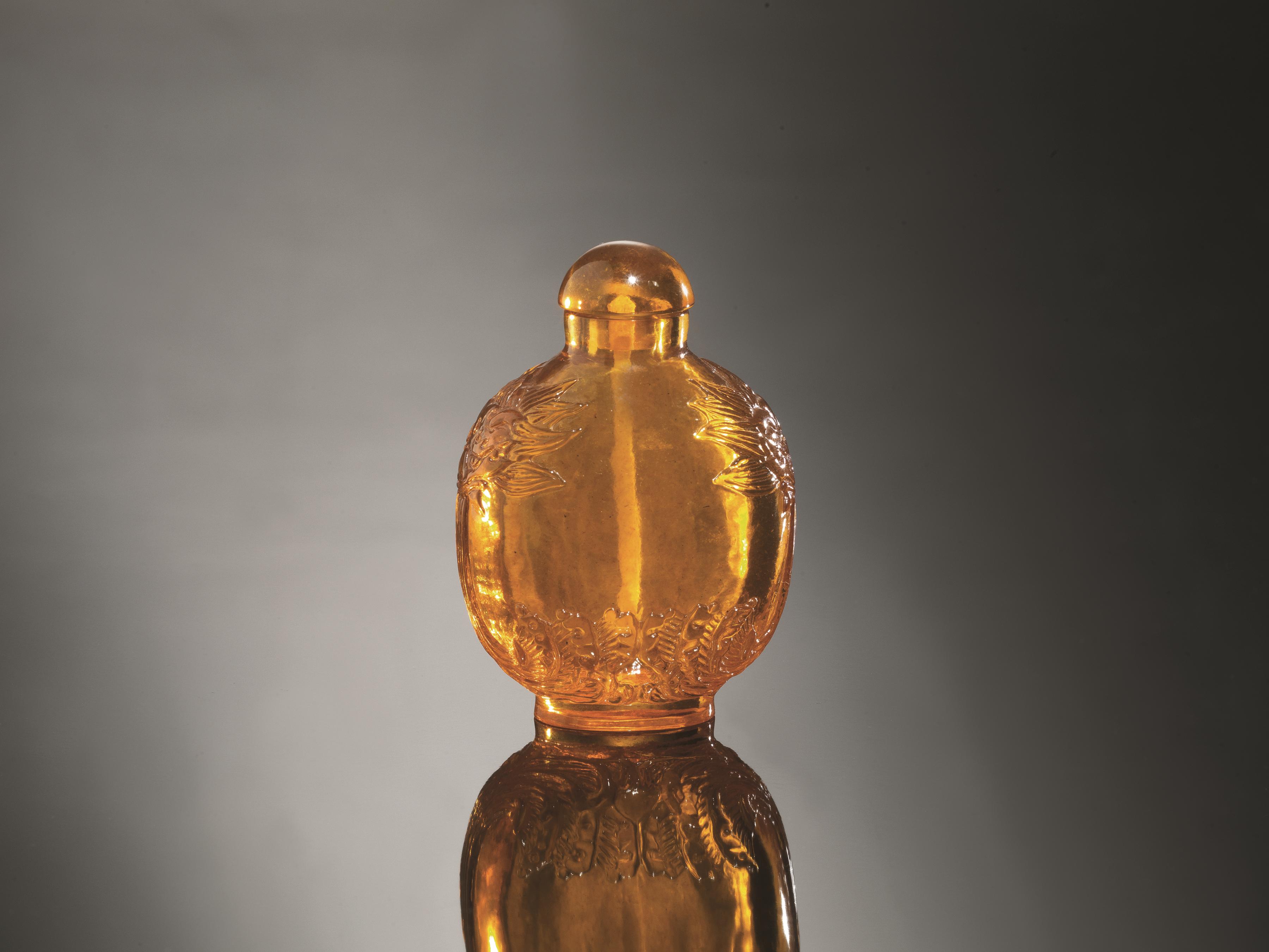 Snuff-bottle, Cina dinastia Qing (1644-1911), in ambra, le anse finemente...