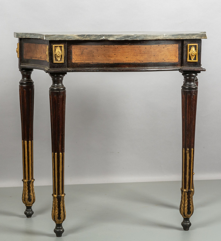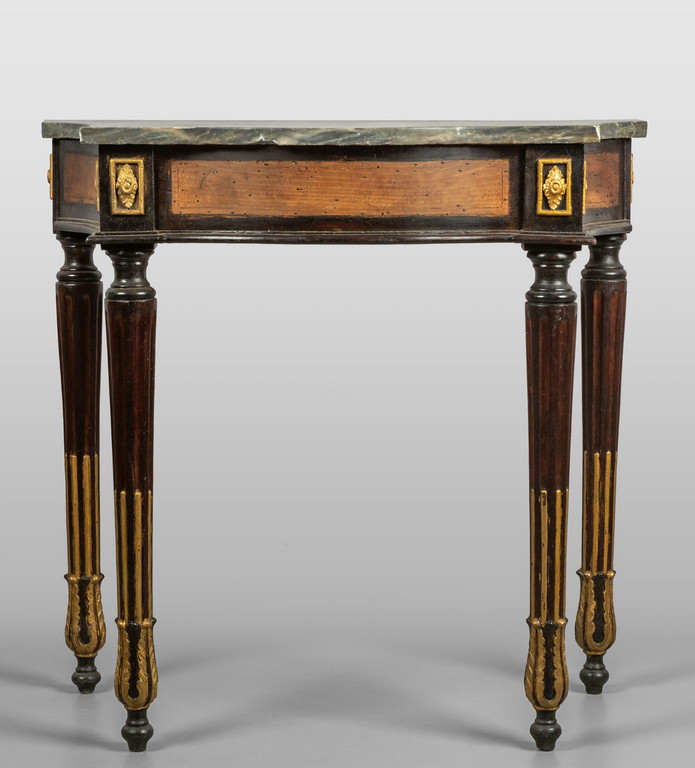 Console Luigi XVI in noce intagliato, laccato e dorato, piano in marmo, Veneto fine sec. XVIII