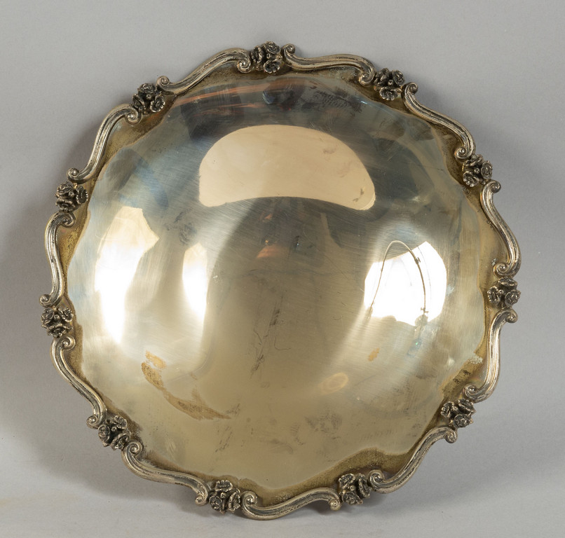 Piatto con piedini in argento con bordo decorato a motivi di fiori