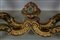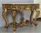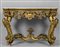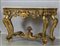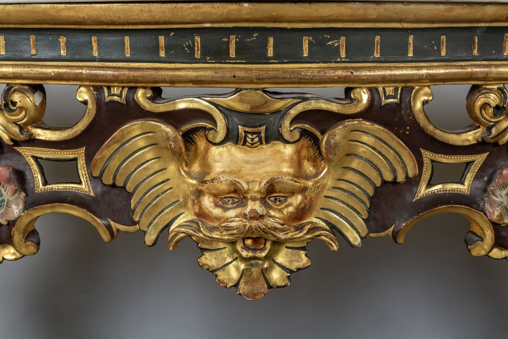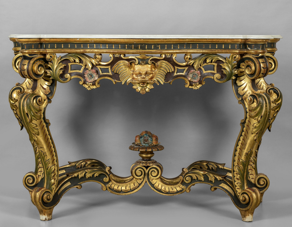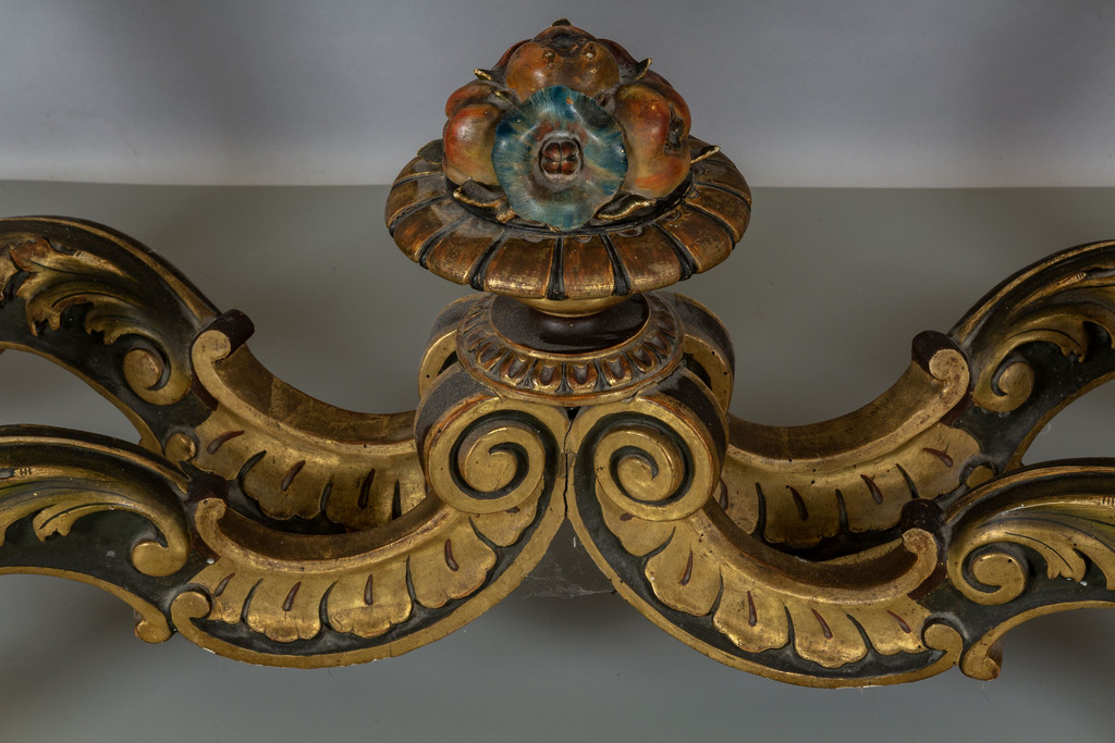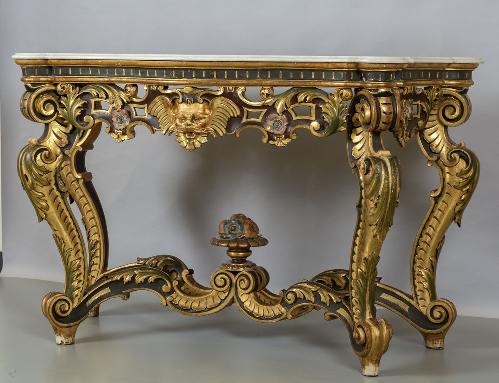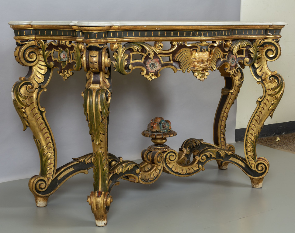 Grande console Luigi Filippo in legno intagliato e laccato, gambe unite da traversa con al centro vaso di fiori, piano in marmo, sec.XIX