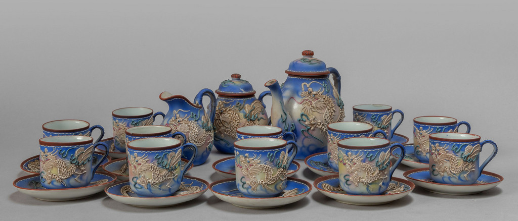 Servizio da caffè in porcellana policroma con dragone in rilievo composto da 12 tazzine con piattino, lattiera, zuccheriera e caffettiera