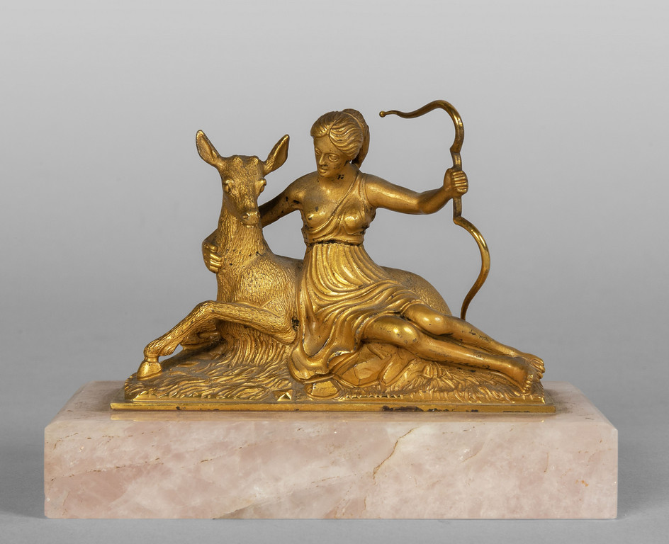 Amazzone, scultura in bronzo dorato poggiante su base in quarzo rosa, inizi sec.XX