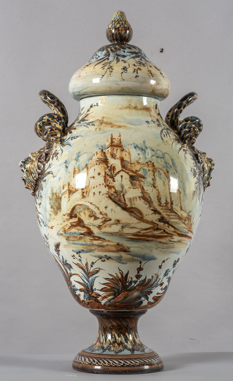 Grande vaso in maiolica con coperchio decorato con l'allegoria dell'estate, f.to Raimondi inizi sec.XX