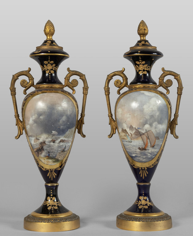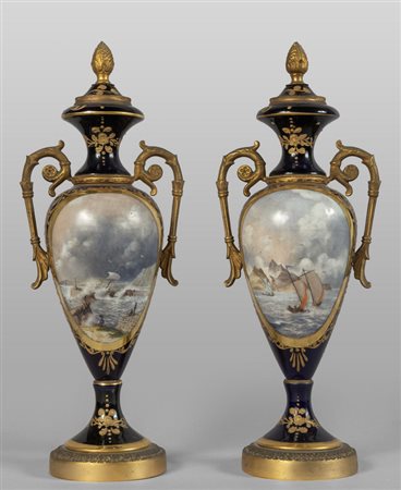 Coppia di vasi in porcellana blu e oro con riserve a motivi di paesaggi marini, Francia sec.XIX