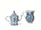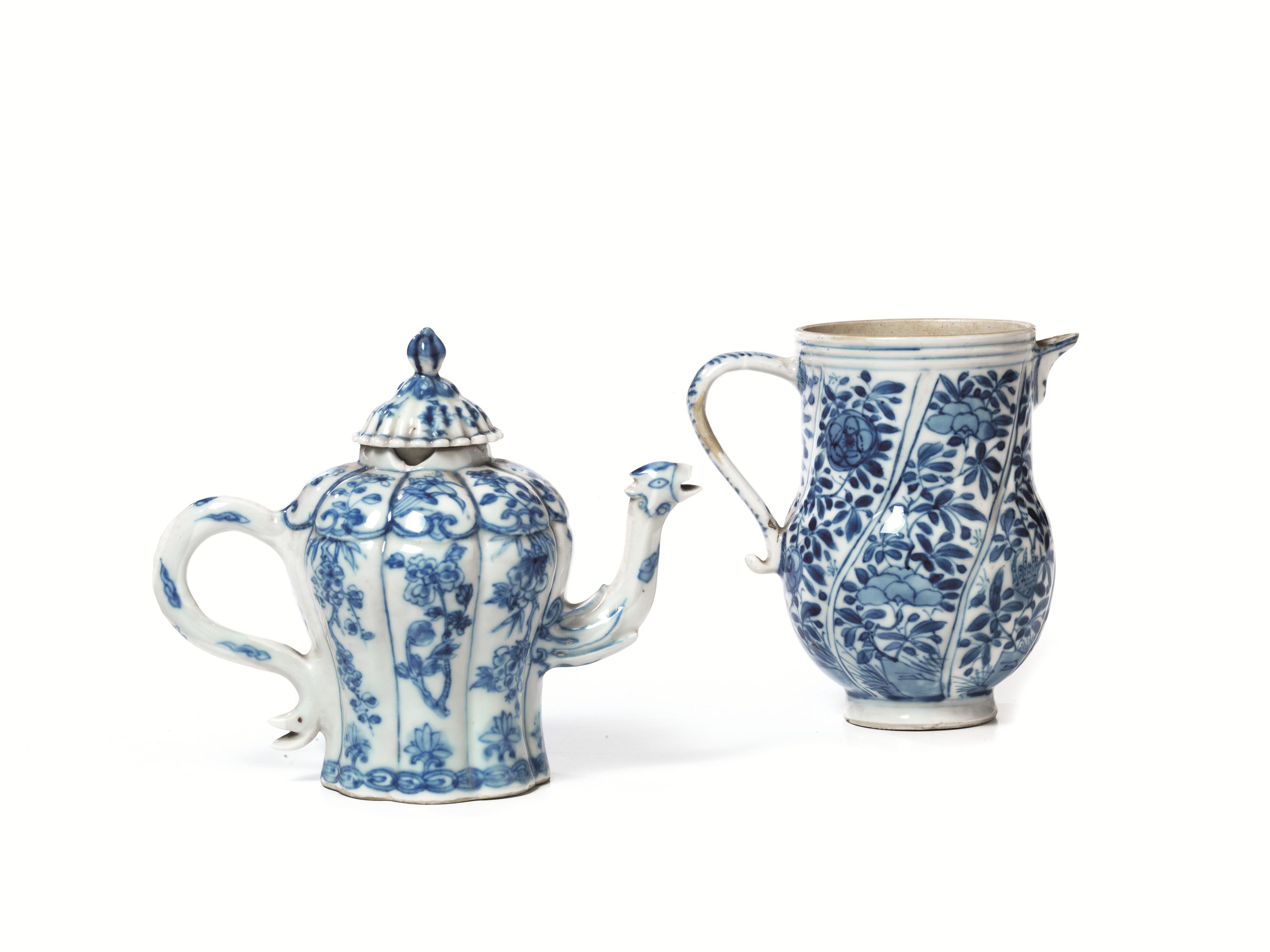 Una teiera con coperchio e un bricco, Cina periodo Kangxi (1662-1722), in porcellana bianca e blu, la teiera di forma lobata e col beccuccio a testa di rapace, il bricco di forma lievemente attorcigliata, alt. cm 13,2; alt. cm 12,1 difetti