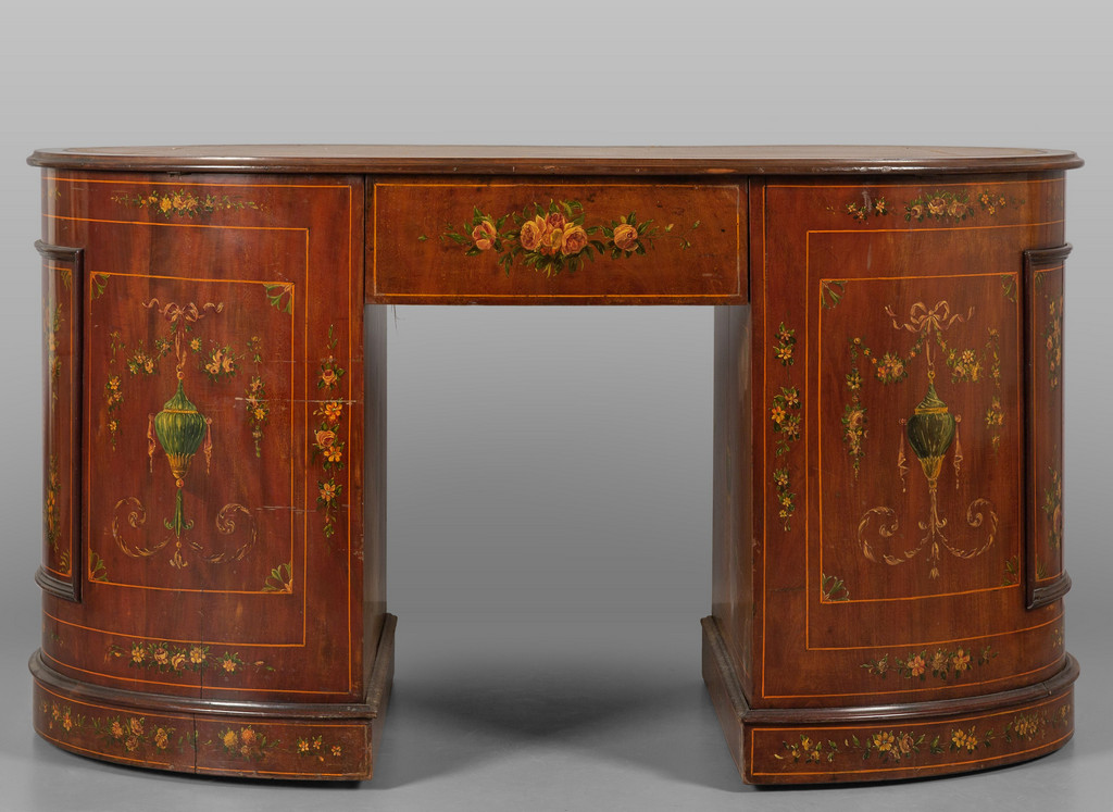 Scrivania in sattinwood a nove cassetti, piano in