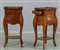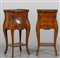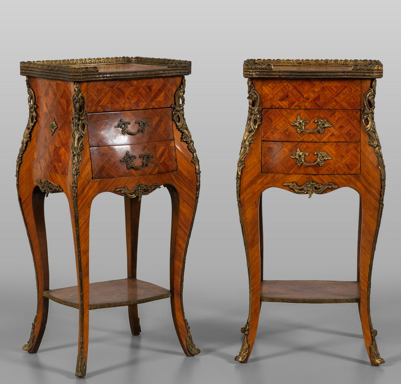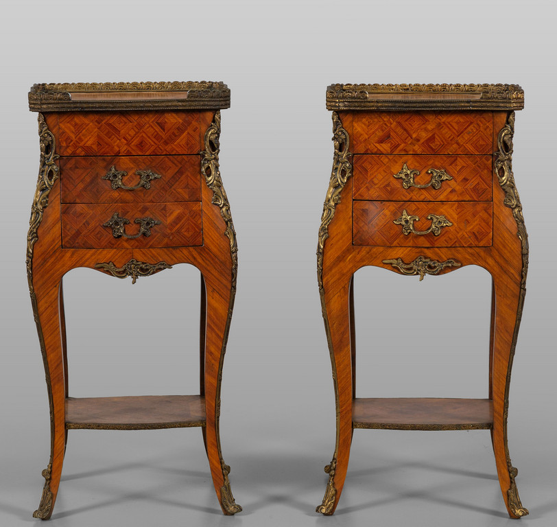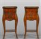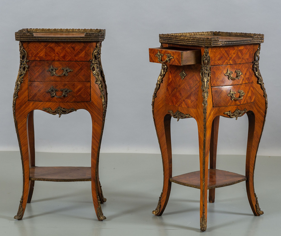 Coppia di comodini da centro in stile Luigi XV movimentati sul fronte e sui fianchi, lastronati a marquetterie con ricca decorazione in bronzo, pianetto sottostante