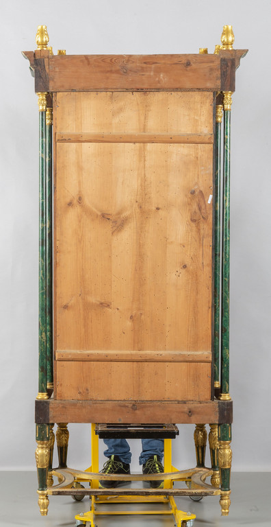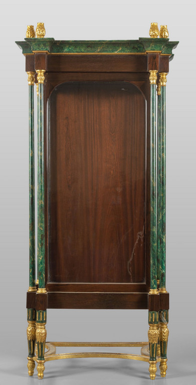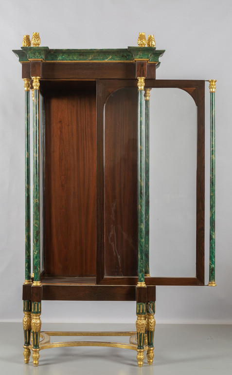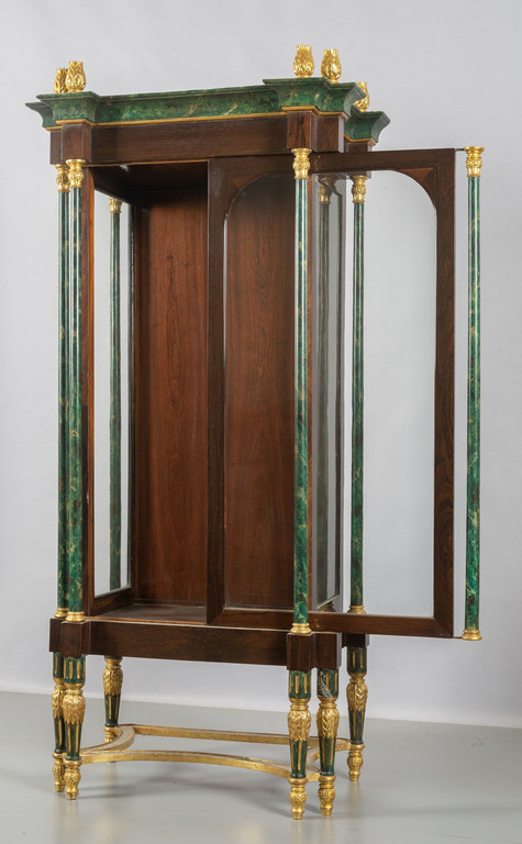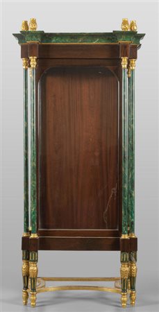 Grande vetrina neoclassica in mogano con colonnine in legno laccato verde e oro, Toscana sec.XIX