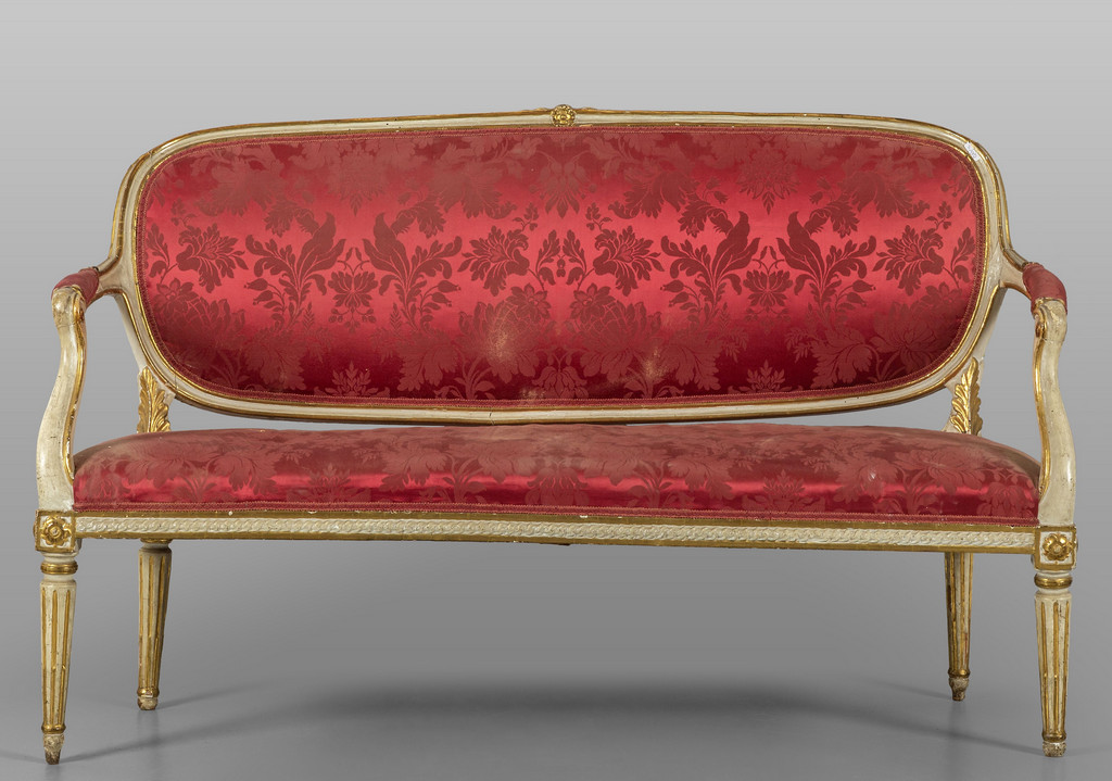 Divanetto Luigi XVI in legno intagliato, laccato e dorato, schienale ovalino, Napoli II metà sec.XVIII