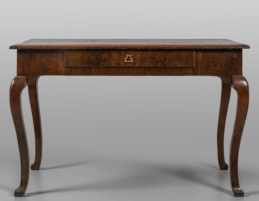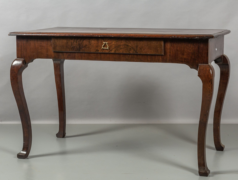 Tavolo Luigi XIV da centro in noce, fascia lastronata in radica di noce, un cassetto, gambe mosse, Toscana I metà sec.XVIII