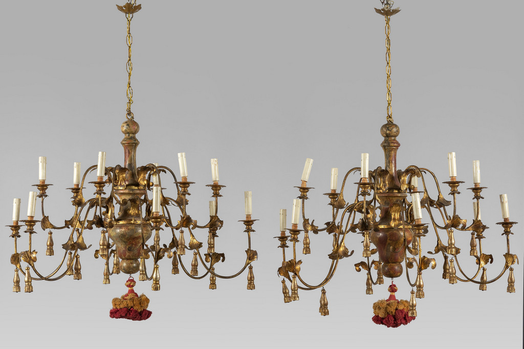 Lotto 1008 | Coppia di lampadari a dodici luci in legno
