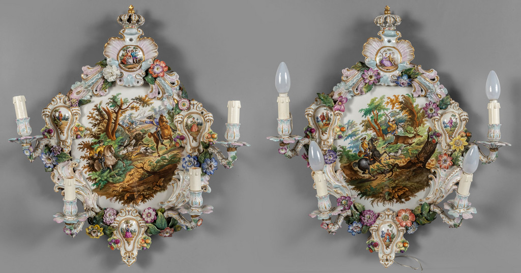 Coppia di apliques in porcellana policroma a quattro luci, inizi sec.XX