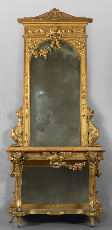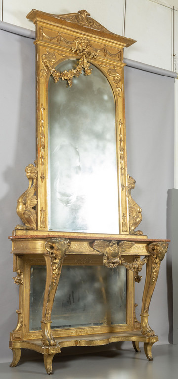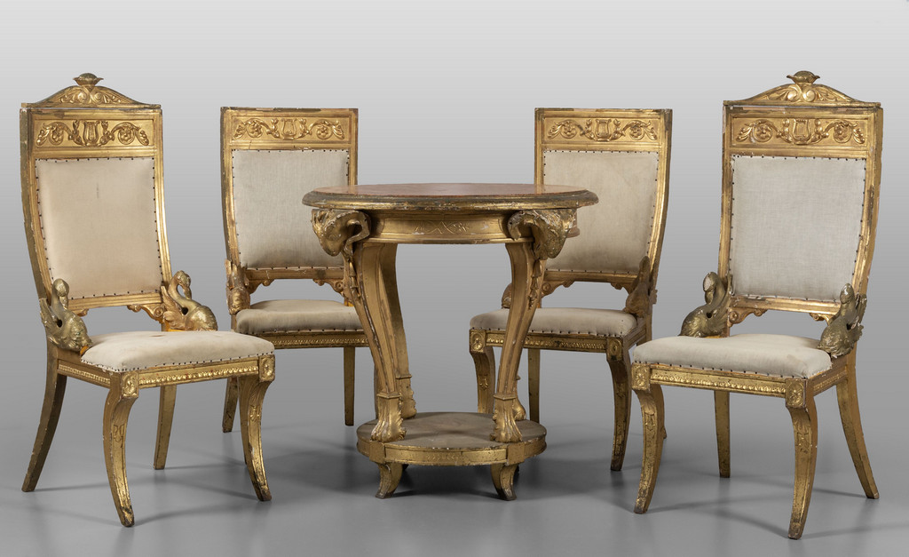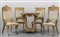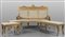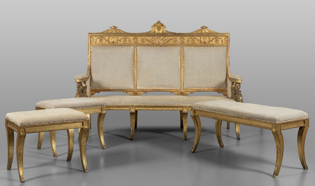 Salotto umbertino in legno intagliato e dorato fine sec.XIX composto da: console con specchiera (cm.144x55xh.315), tavolo (diam.cm.80xh.78), quattro sedie, un divano e due più una panchetta