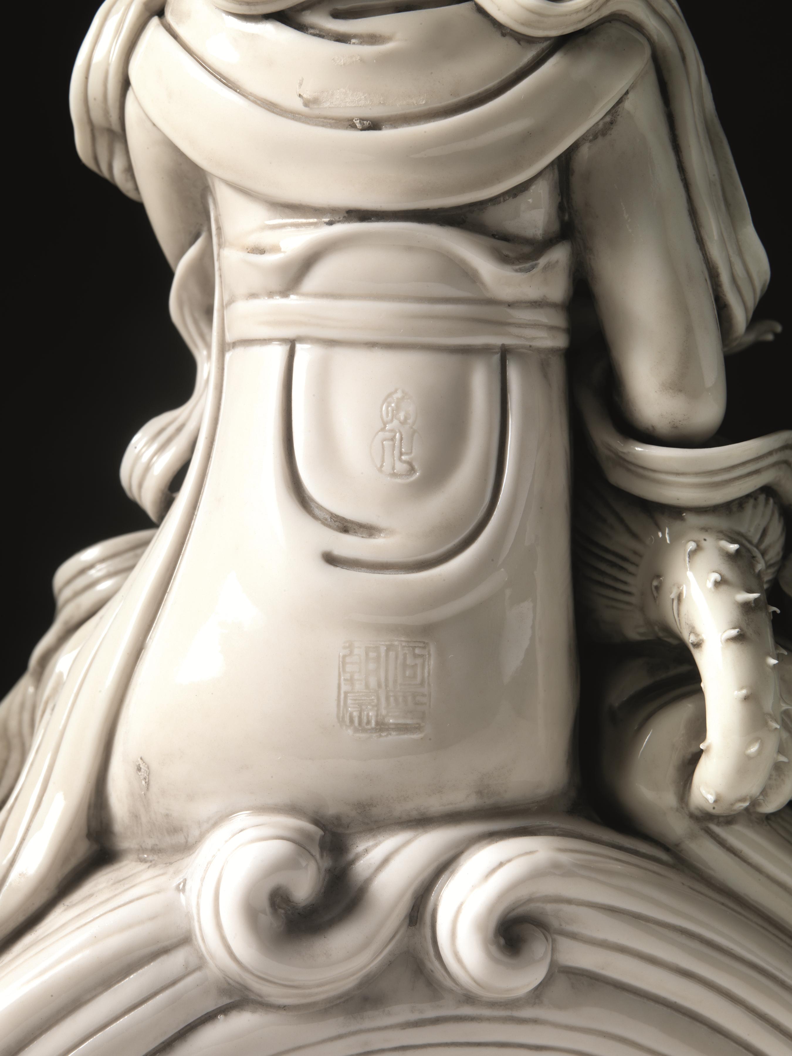 Scultura Cina sec. XX, in porcellana bianca Dehua raffigurante Bodhisattva assisa su di un'onda avvolta da fiori di loto e draghi, alt. cm 37,5