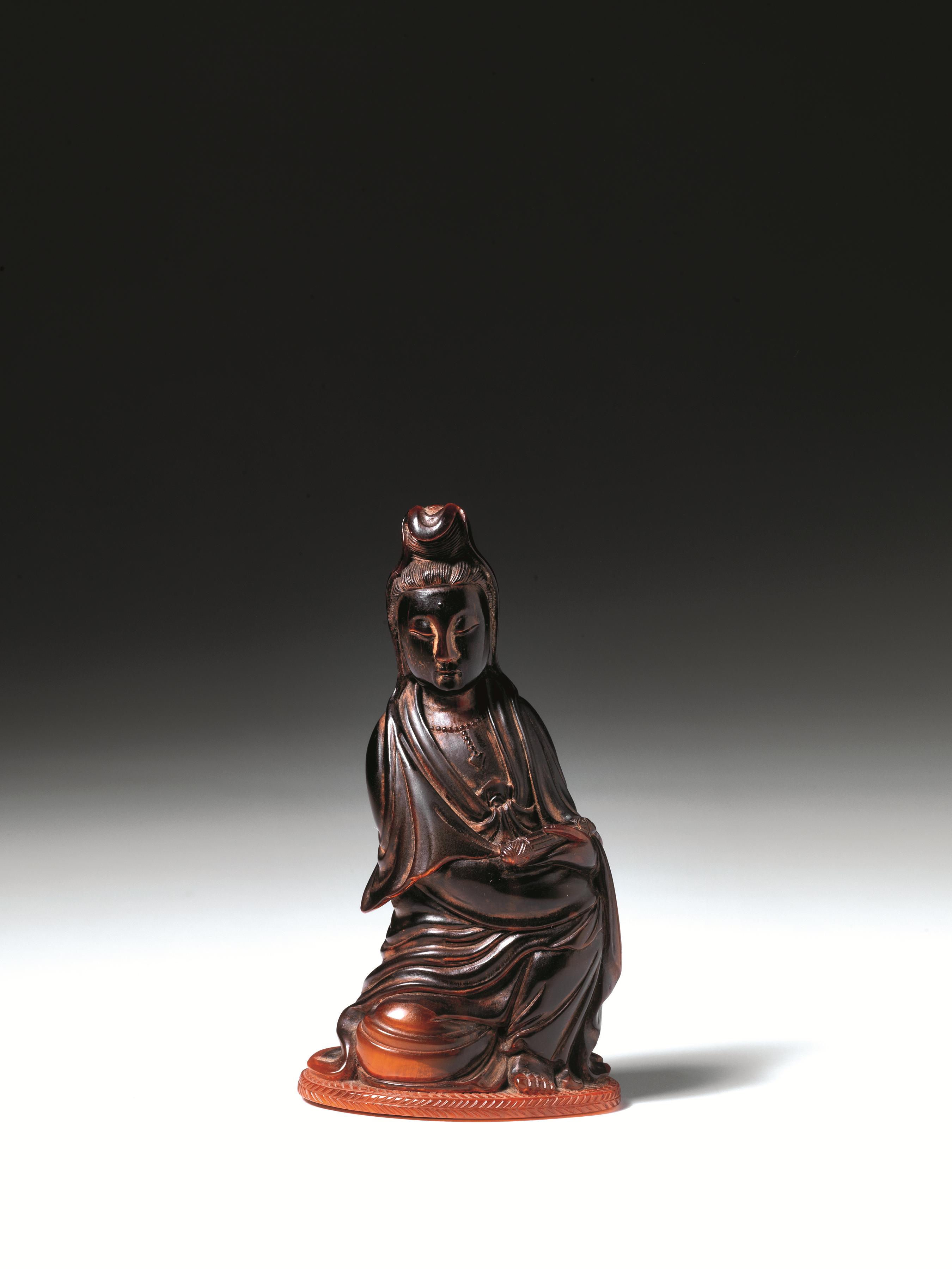A Chinese carved horn Guanyin holding a scroll, 19th c.