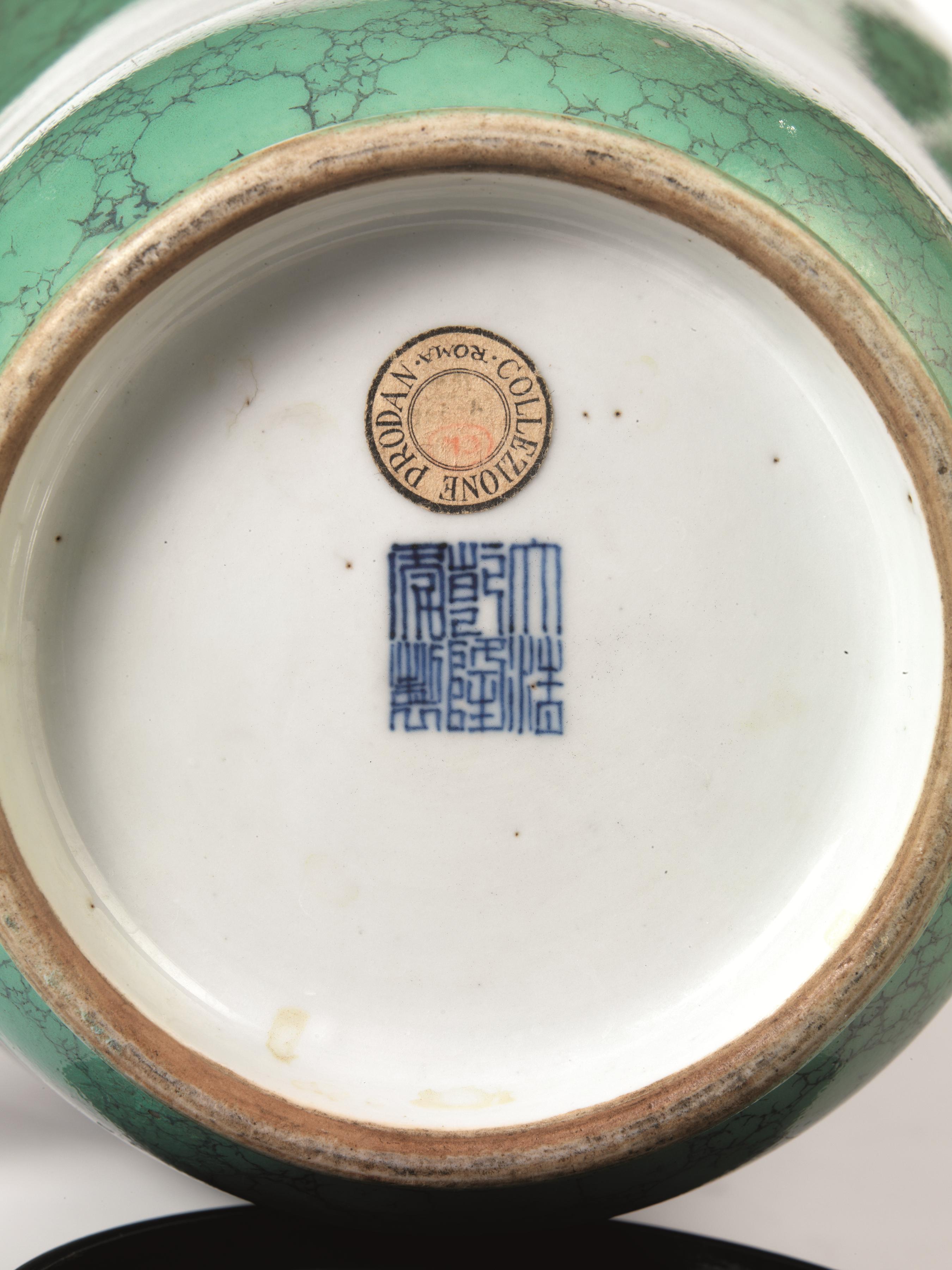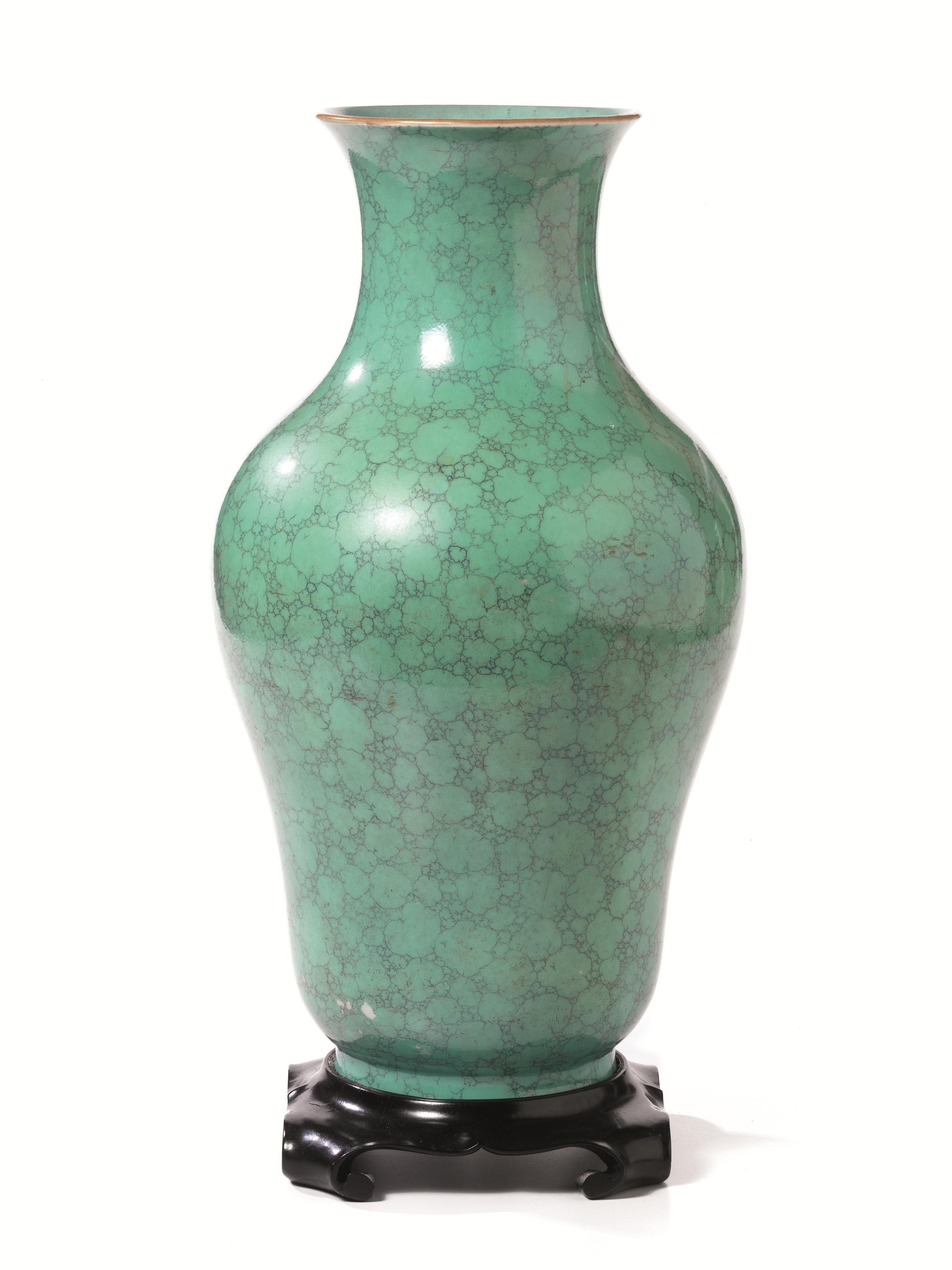 Vaso, Cina sec. XVIII-XIX, a balaustro, in porcellana a smalto verde marmorizzato, reca marchio Qianlong, alt. cm 40, difetto allo smalto