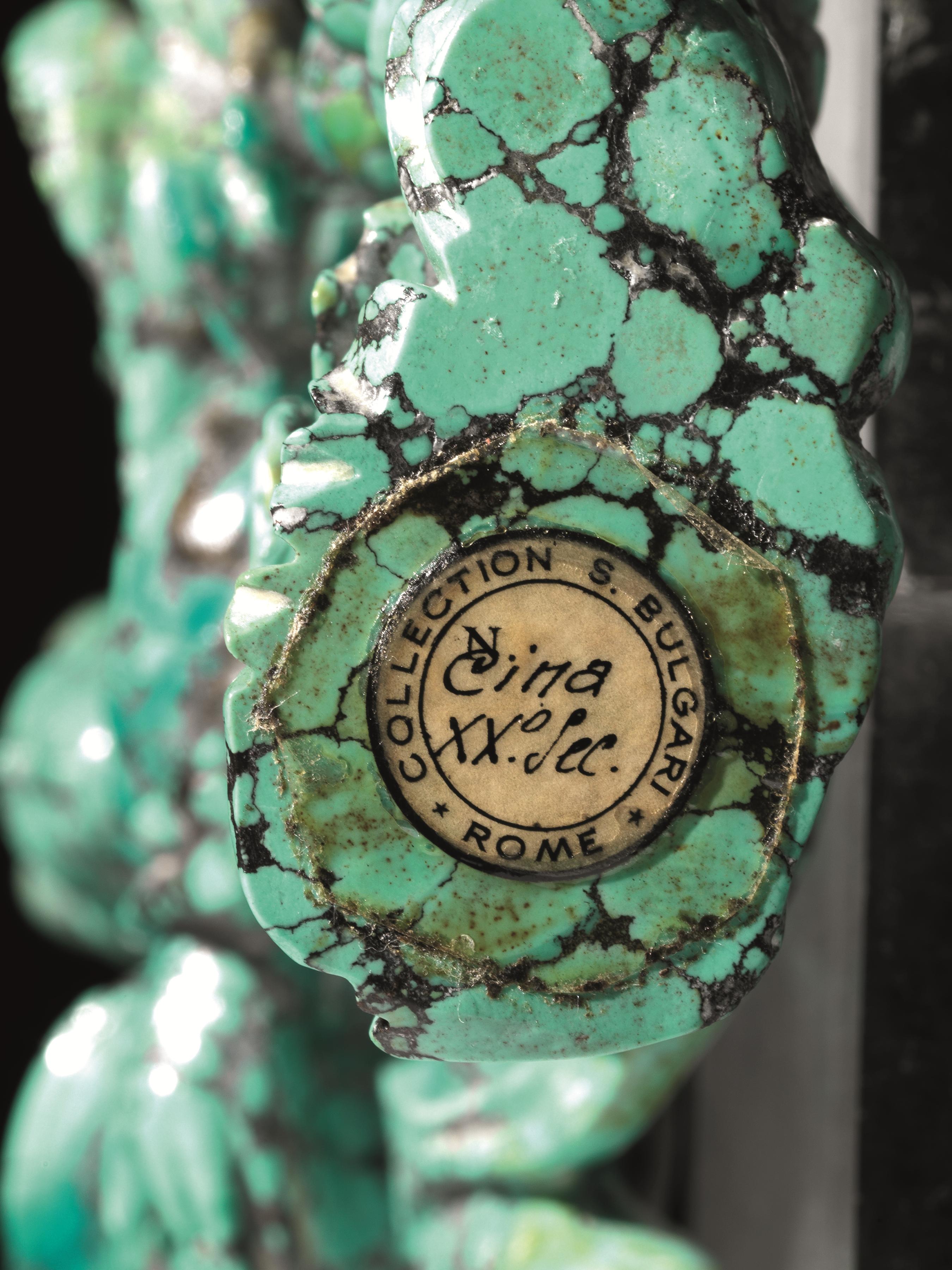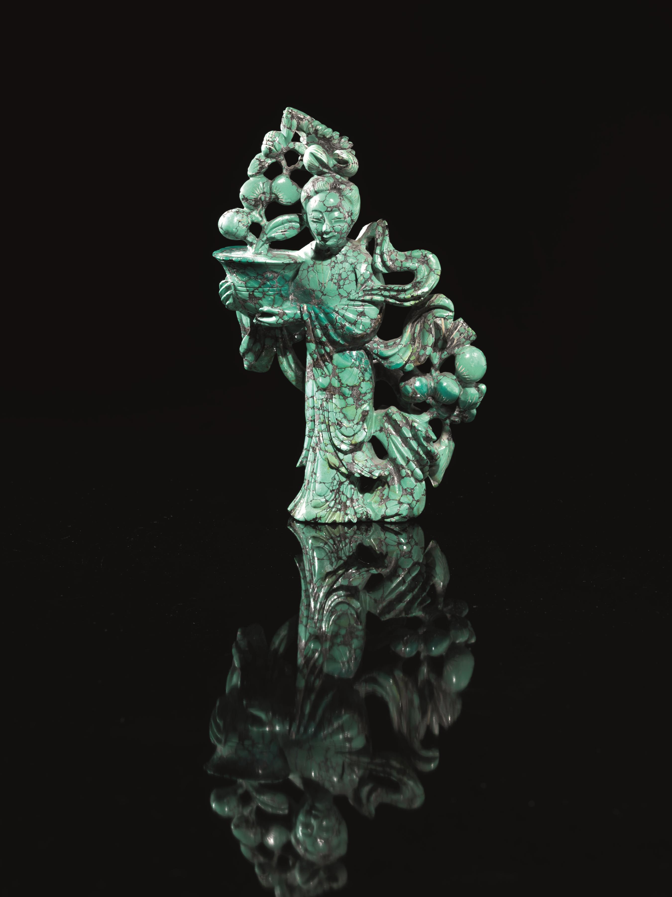 Intaglio, Cina sec. XX, in radice di turchese, raffigurante Guanyin, reggente un vaso con pianta fiorita, alt. cm 15