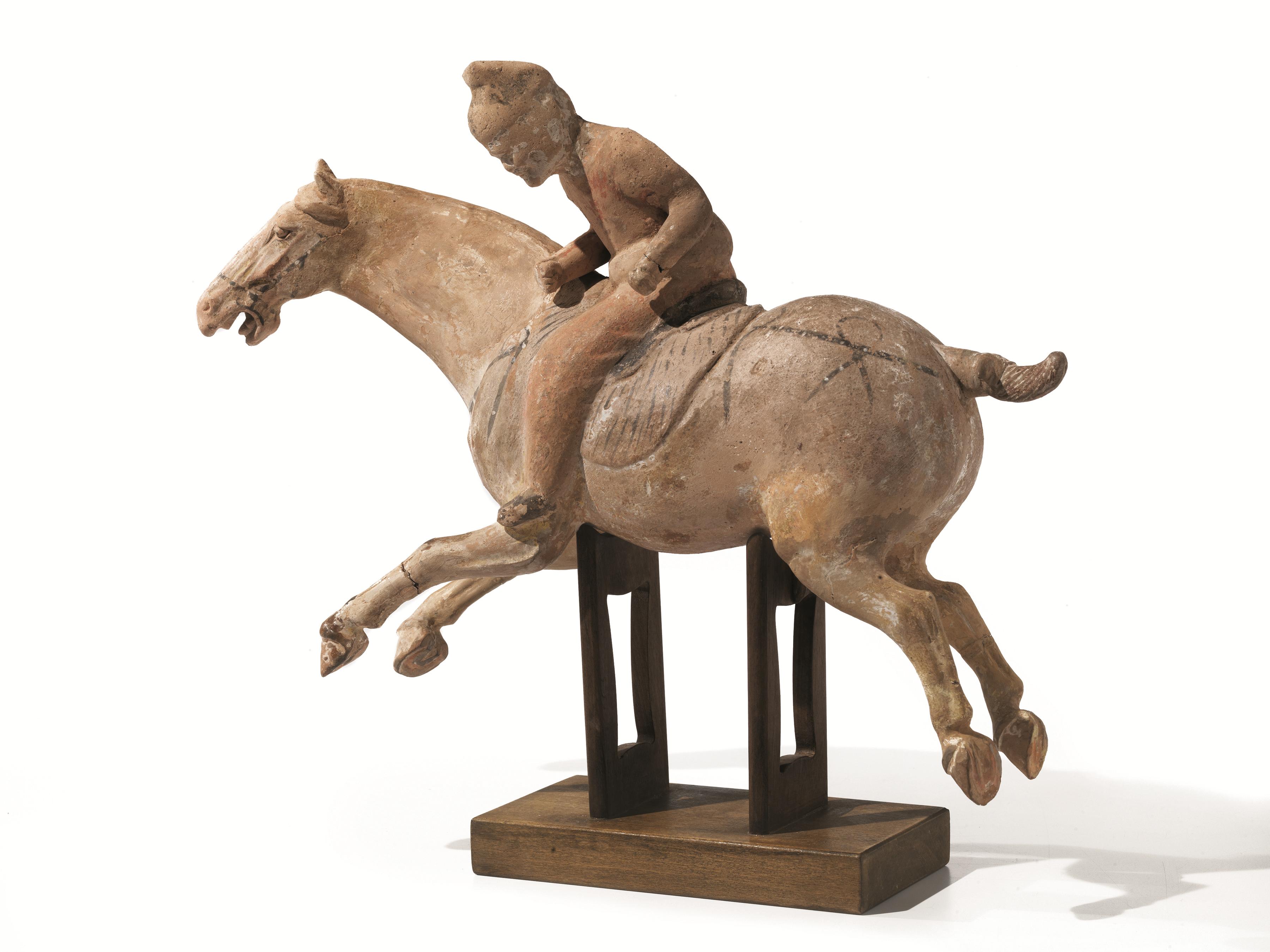 Cavallo con guerriero Cina dinastia Tang (618-907), in terracotta con tracce di pigmenti, lung. cm 40,5, restauri alla gamba del cavallo e al braccio del guerriero