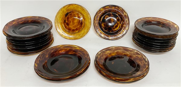 Manifattura di Empoli, lotto di ventidue piatti in vetro soffiato e marezzato.