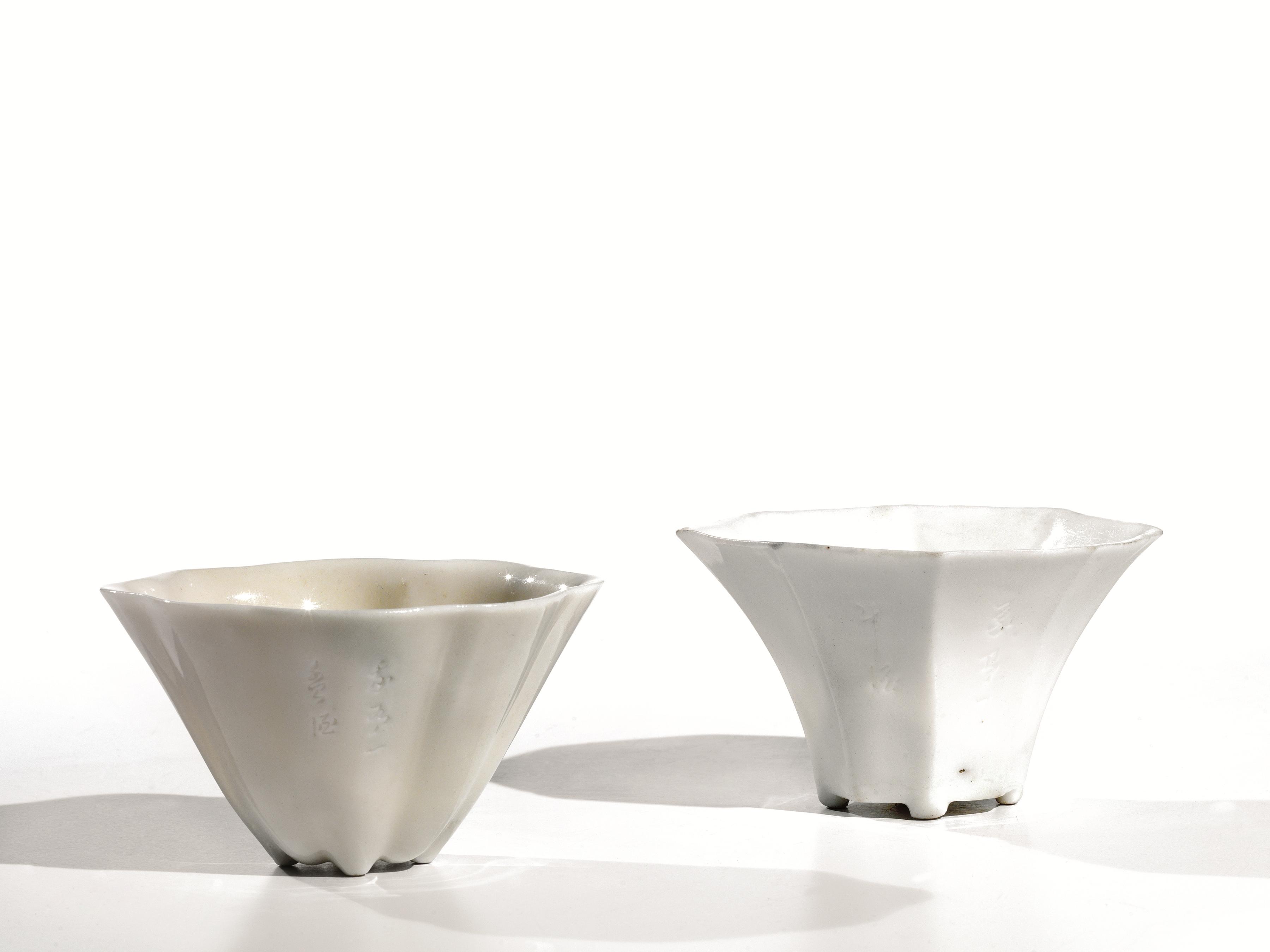 Due coppe da libagione, Cina sec. XVIII, in porcellana blanc de Chine, recano...