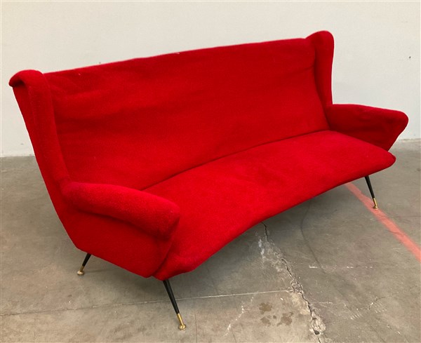 Divano a orecchioni con rivestimento in bouclé rosso, piedi in ferro con terminali in ottone. Italia, anni '60. (cm 203x93x75) (lievi difetti)