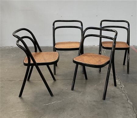 Gruppo di quattro sedie in faggio curvato verniciato nero con seduta in paglia di Vienna. Italia, seconda metà secolo XX. (cm 47x77x42) (difetti)