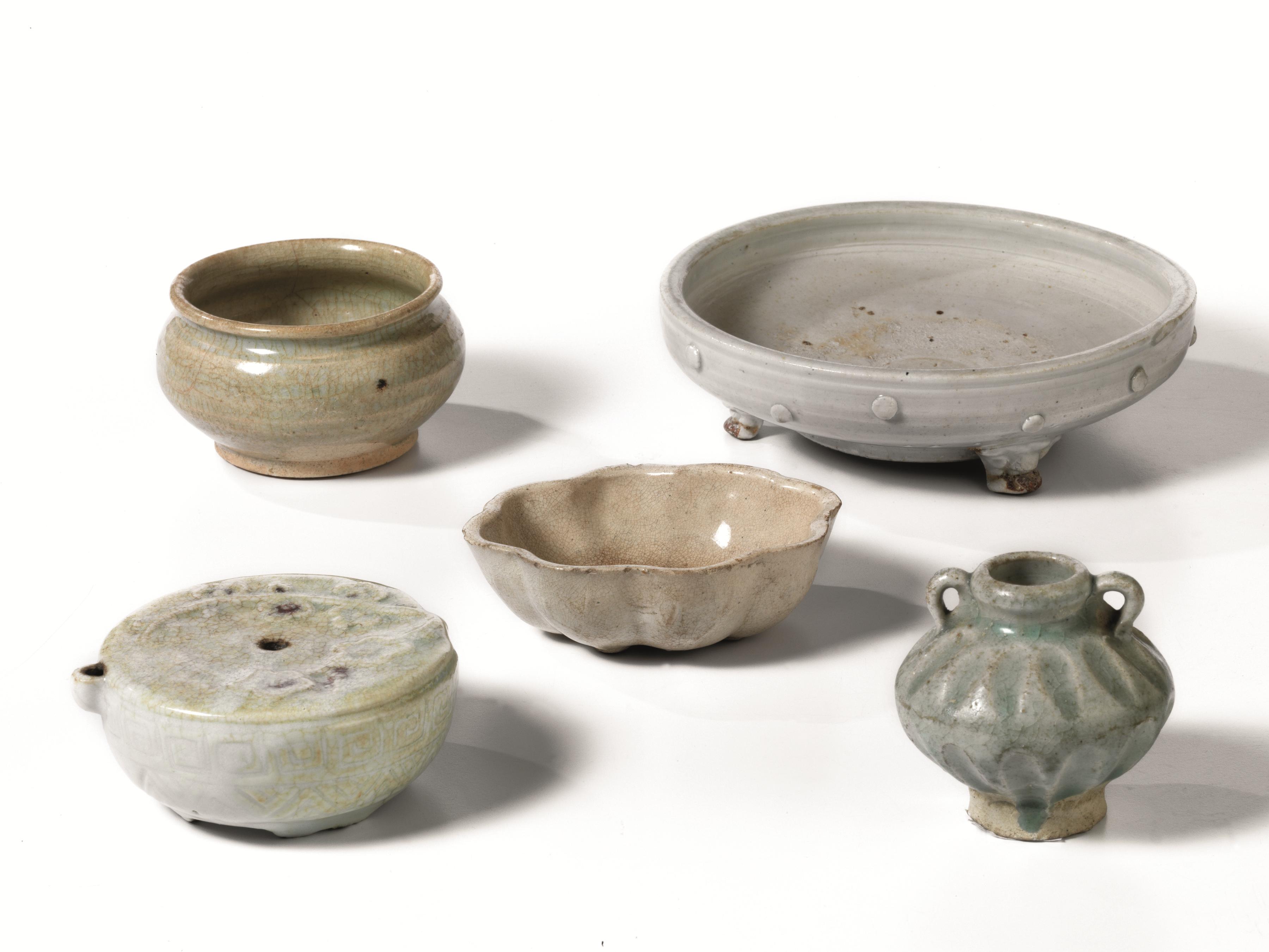 il vaso dalla forma biansata, e una ciotolina e una lampada ad olio Cina sec. XIX, in ceramica, cm 6,4; cm 9,5; cm10,6; cm 9,5 (4)
