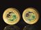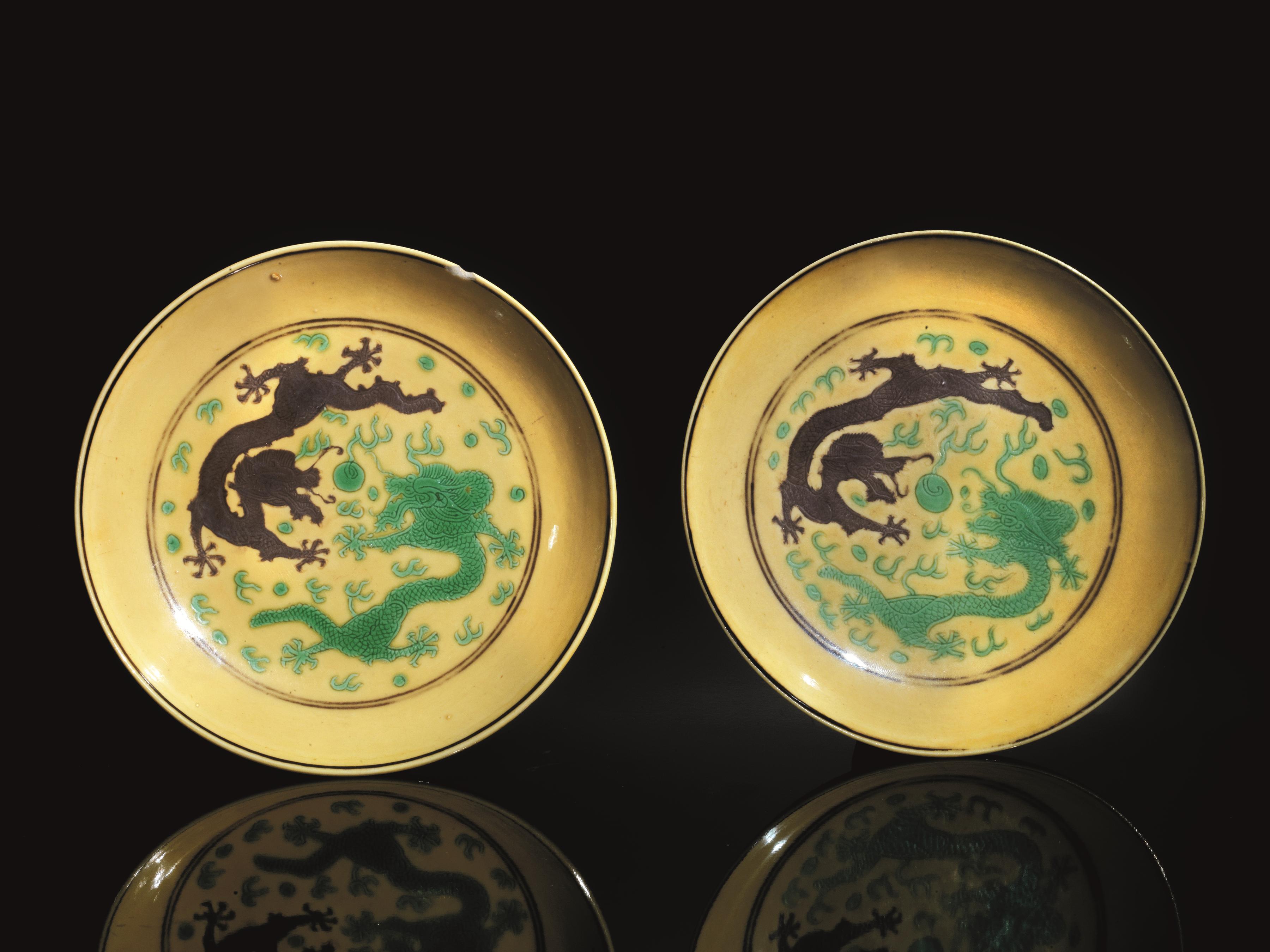 Coppia di piattini, Cina, marchio e periodo Guanxu (1875-1908), in porcellana gialla, decorati da draghi color melanzana e verde al fronte, e tralci di vite al recto, diam cm 12,8, uno con sbeccatura (2)