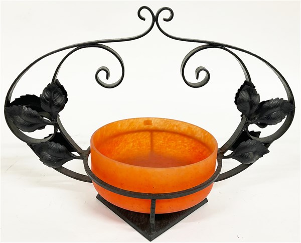 Centrotavola con struttura in ferro battuto e sagomato con coppa in vetro arancione firmata Rethondes (h cm 30) (lievi difetti). Secolo XX. (lievi difetti)