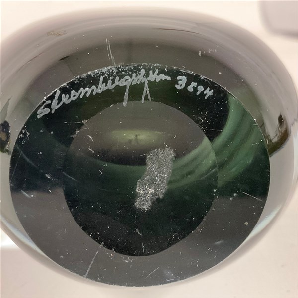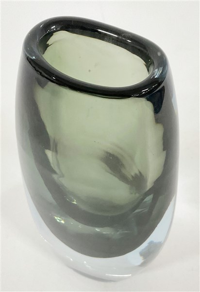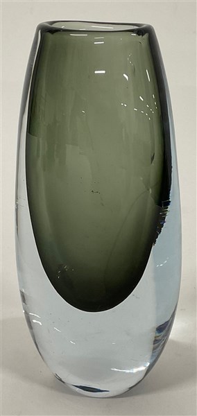 Vaso in vetro sommerso trasparente incolore e verde. Manifattura nord europea, secolo XX. Firmato e numerale alla base.