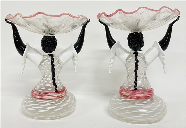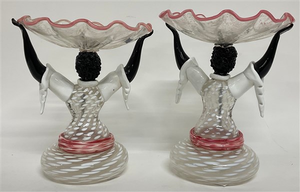 Manifattura di Murano, due alzatine in vetro soffiato policromo a guisa di moretti e coppa polilobata. Secolo XX. (cm 20x23) (difetti)