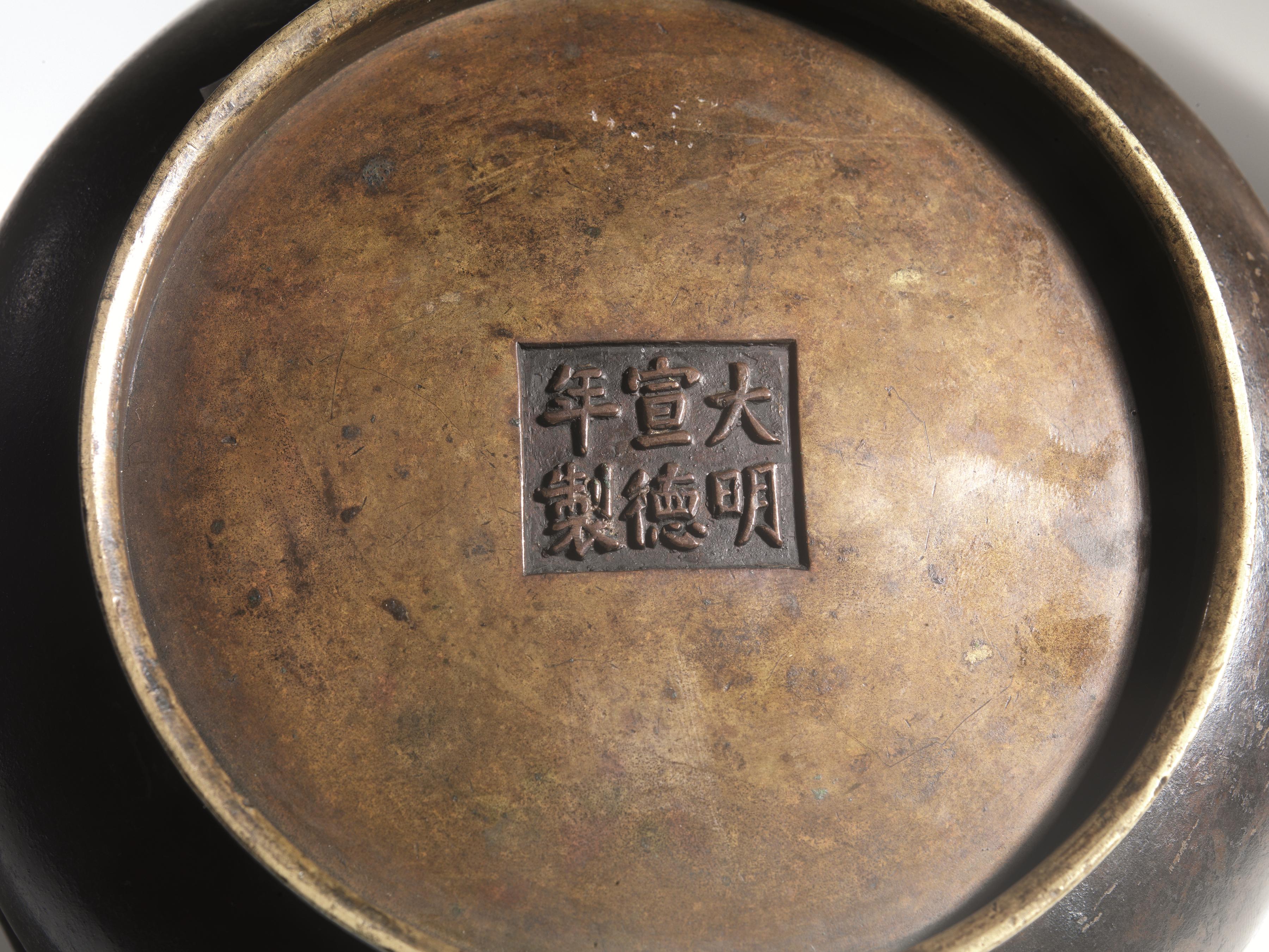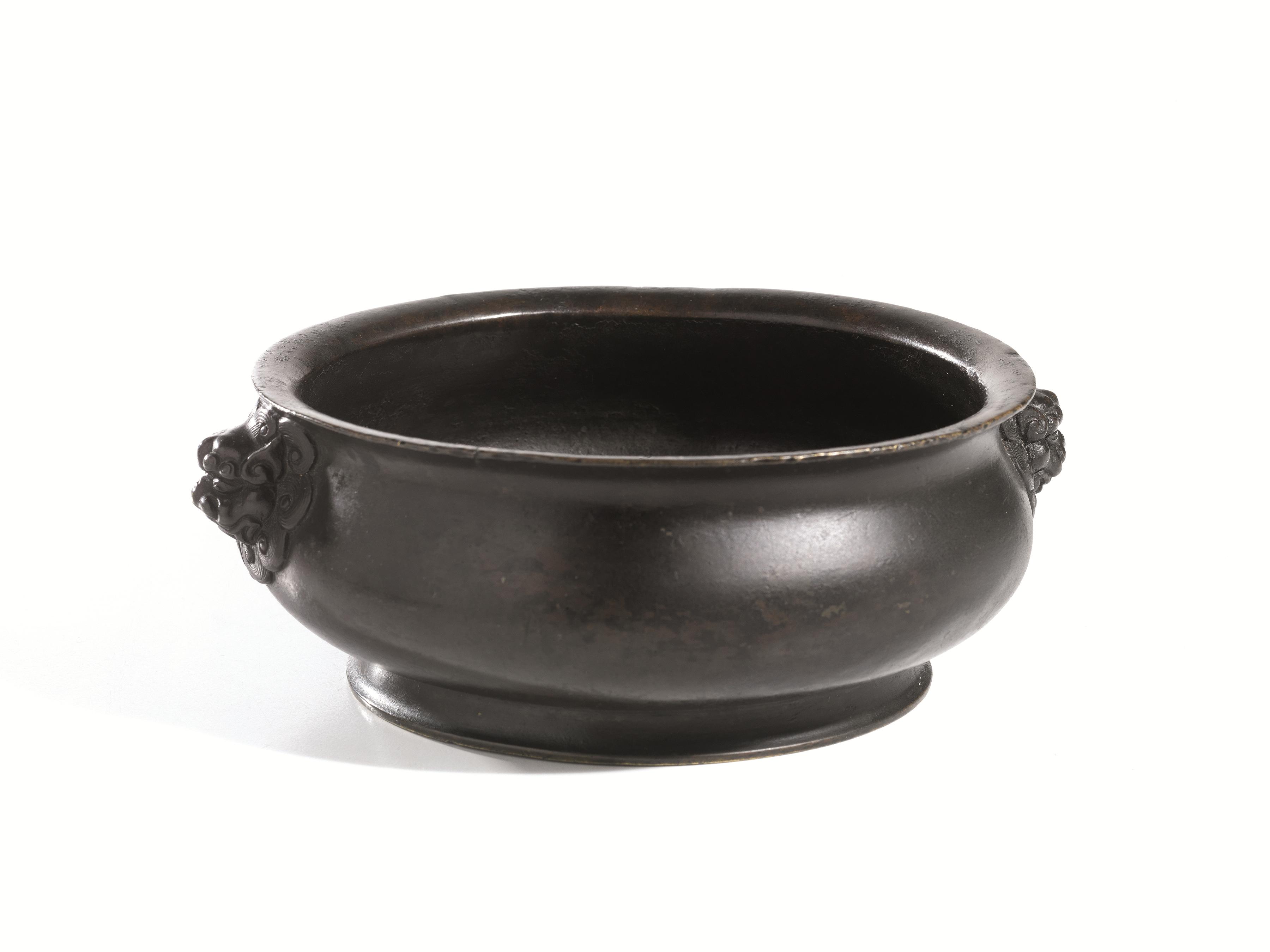 Incensiere, Cina sec. XVIII, in bronzo, il corpo liscio e le anse a teste leonine, reca marchio Xuande, diam cm 19