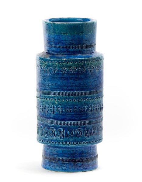 Vaso della serie "Rimini blu". Produzione Bitossi, Montelupo fiorentino, anni '60. Ceramica formata al tornio smaltata nei toni del blu sotto vetrina e grafite con decorazioni geometriche. (h cm 27) (lievi difetti)