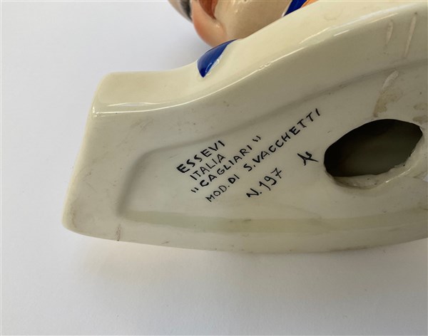 Testa in ceramica policroma raffigurante donna con copricapo tradizionale. Anni '30/'40. Marcata e numerata 197 sotto la base ESSEVI ITALIA "CAGLIARI" MOD. DI S.VACCHETTI. (h cm 20) (difetti)
