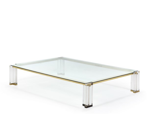 Grande tavolo da salotto con struttura in ottone e plexiglass, piano in cristal
