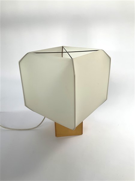 Lampada da tavolo modello "Bali". Produzione Danese, Italia, 1958. Multistrato in ottone, paralume in PVC. (h cm 41)