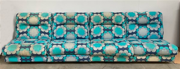 Quattro poltrone con struttura in vetroresina verniciato bianco e tessuto a fiori blu. Italia, anni '70. (difetti)