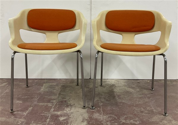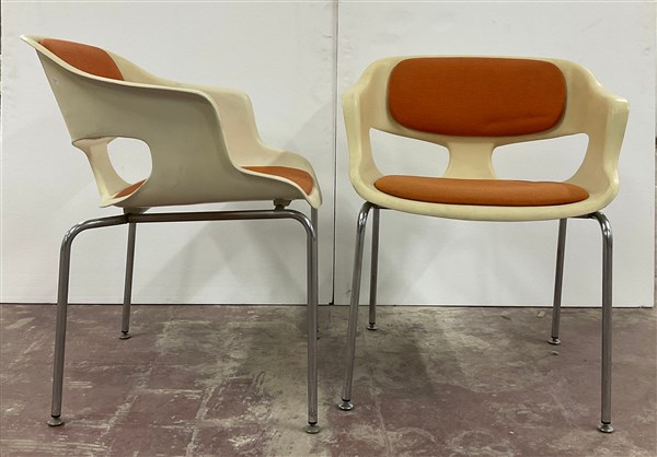 Coppia di poltroncine. Produzione Soloform, Germania, 1972. Materiale plastico bianco, tubolare metallico e tessuto arancione. Marcate sotto la base. (cm 61x74,5x50) (lievi difetti)