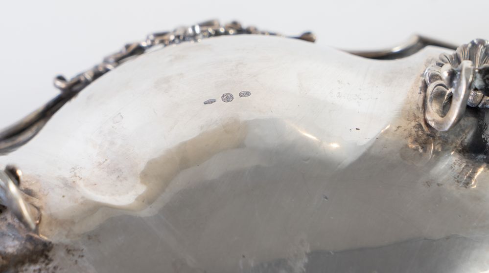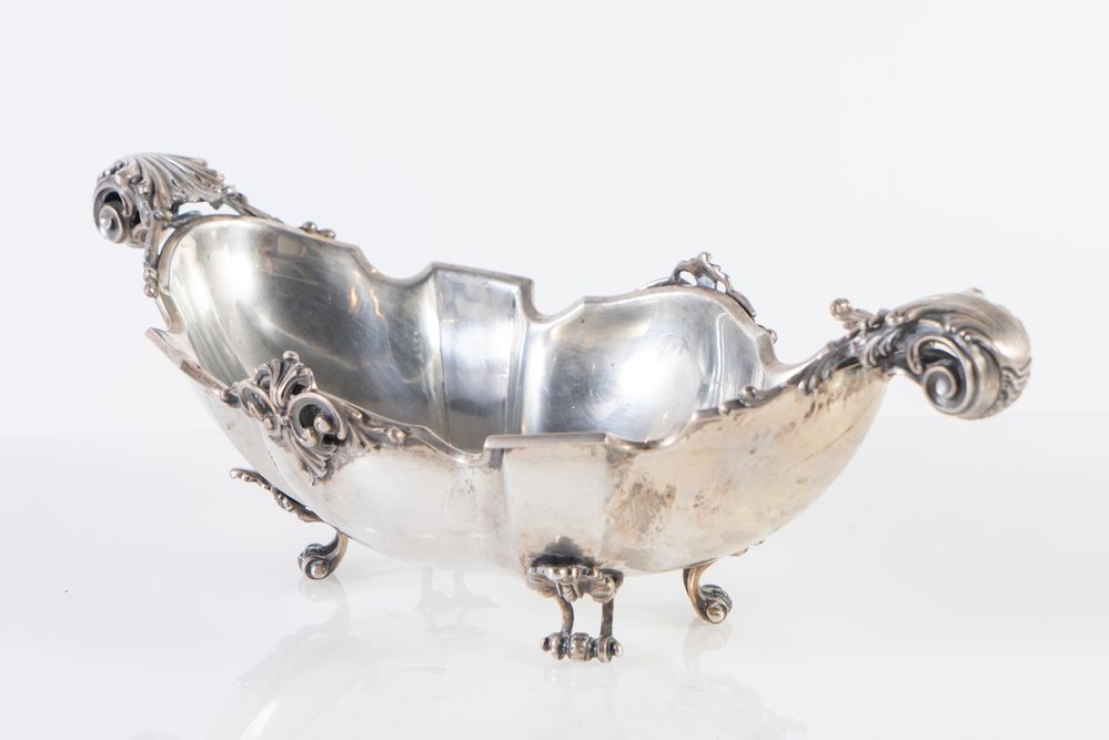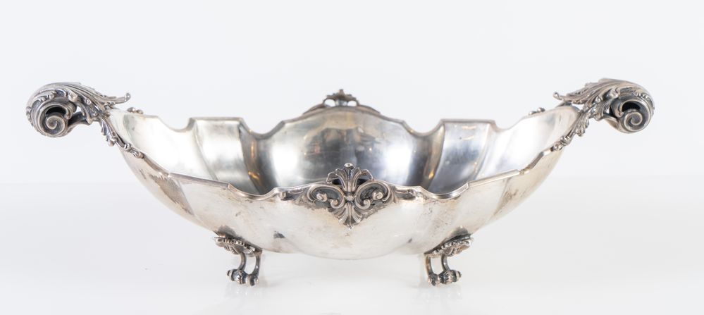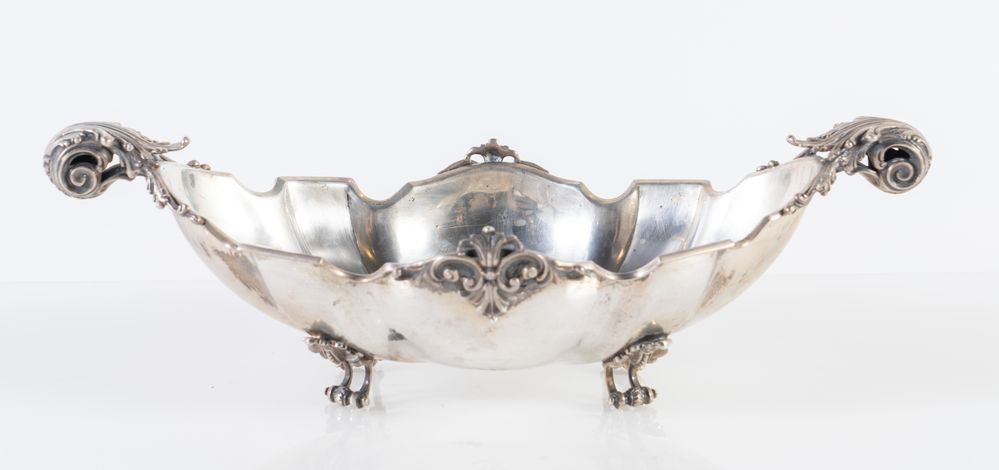 FASSI ARNO, Milano, dal 1935 al 1944. Centrotavola in argento 800. A lato reca punzoni: 800, stemma dell'argentiere, losanga locativa con fascio littorio 48MI. Cm 14,5x47x22,7. Peso: 1238 gr.
