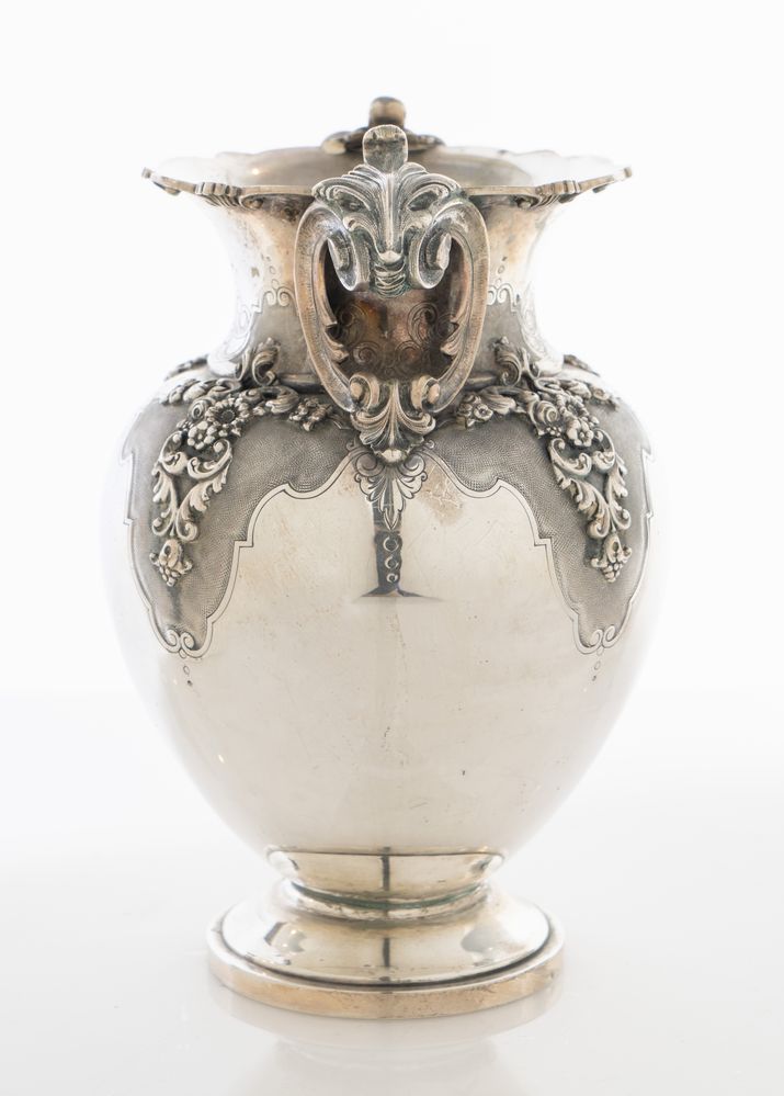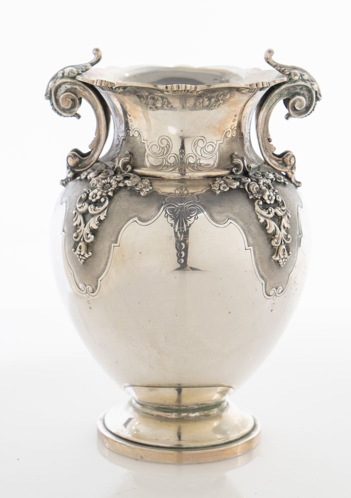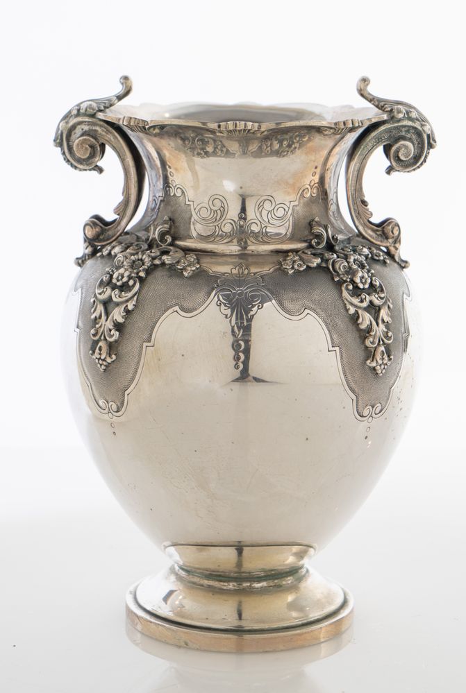 FASSI ARNO, Milano, XX secolo. Vaso in argento 800. Sotto la base reca punzoni: 800, stemma dell'argentiere, losanga locativa 48MI. Cm 28x19x18. Peso: 1335 gr.