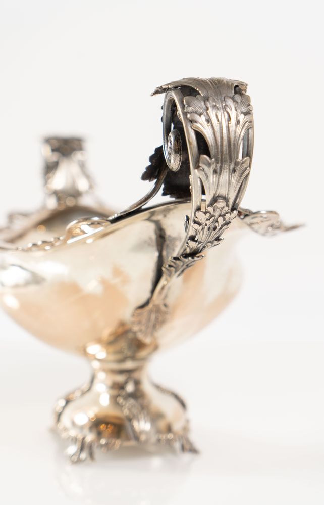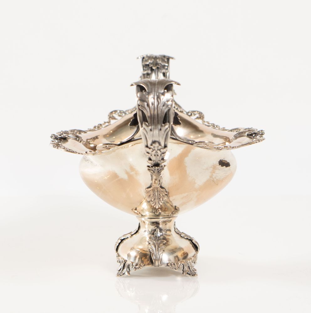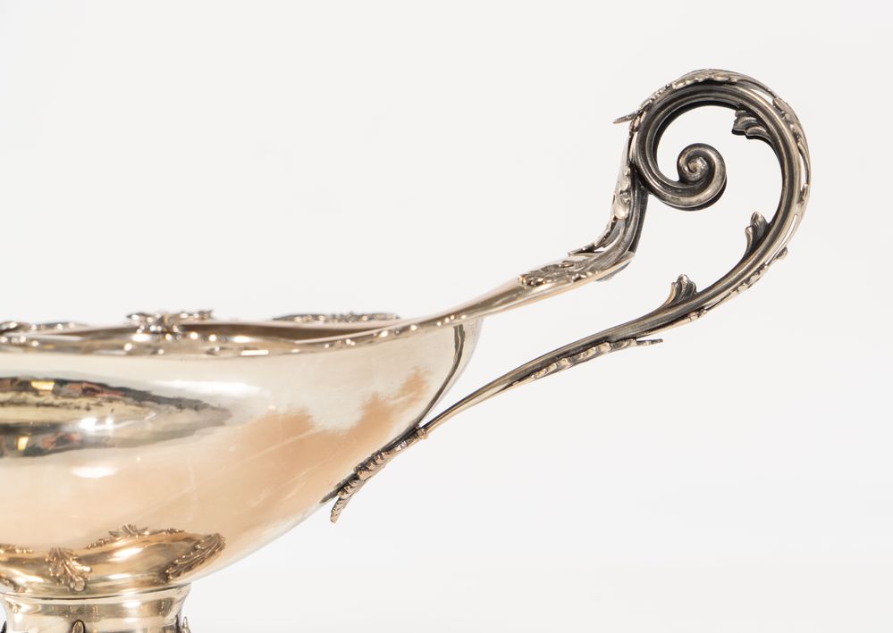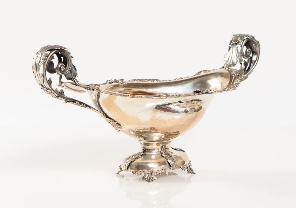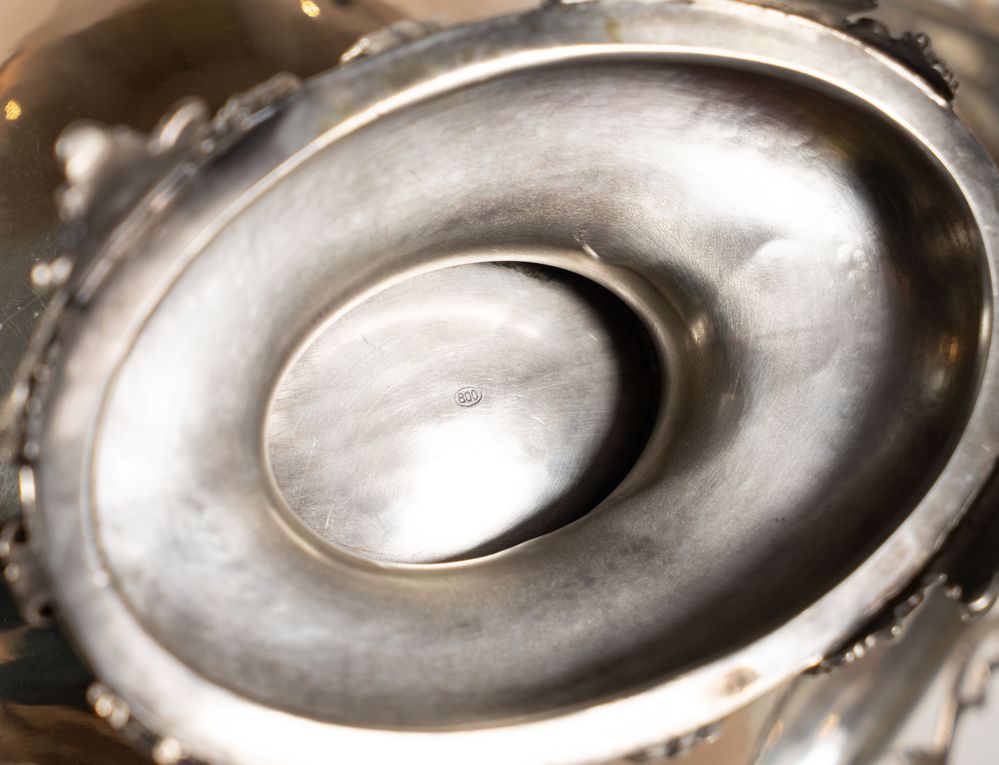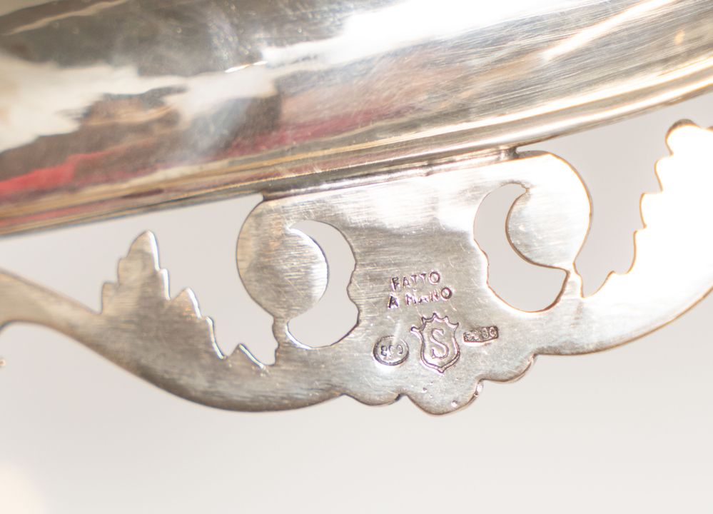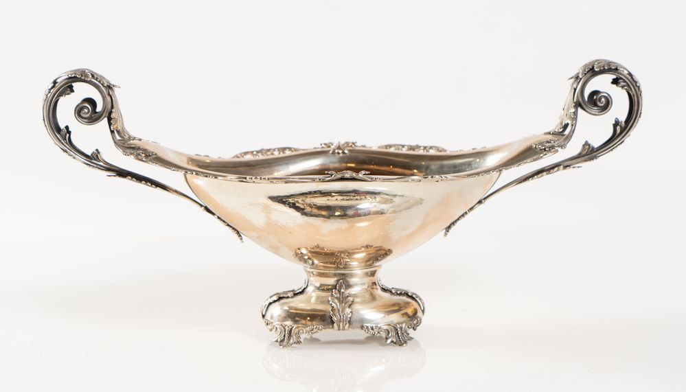 SCANABISSI BRUNO, Bologna, XX secolo. Centrotavola in argento 800. Sotto la base reca punzone 800. Sul bordo inferiore reca punzoni: 800, fatto a mano, stemma dell'argentiere, losanga locativa 99BO. Cm 25x55x26,5. Peso: 1.919 gr.
