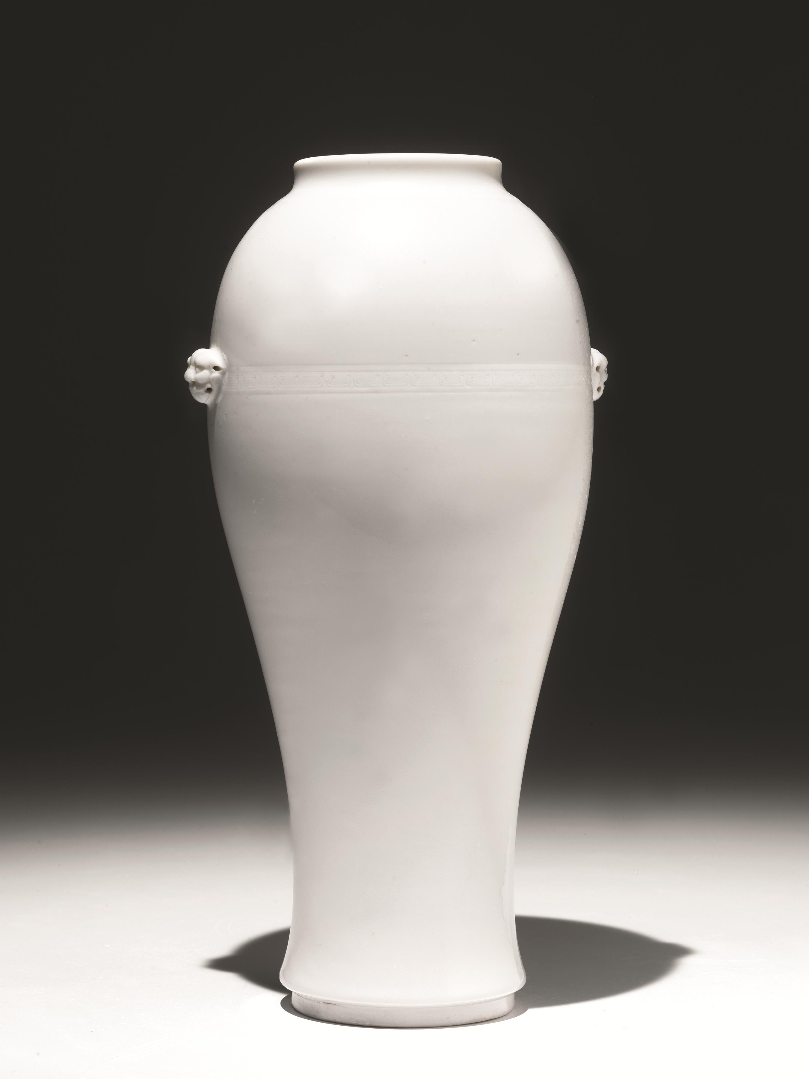 Vaso meiping Cina sec, XVIII, in porcellana Dehua a decorazione segreta, anse...