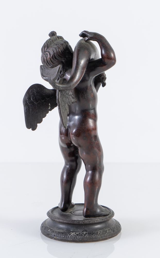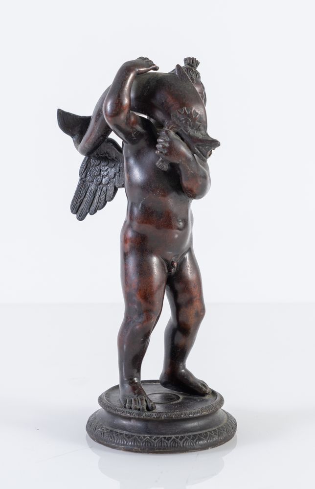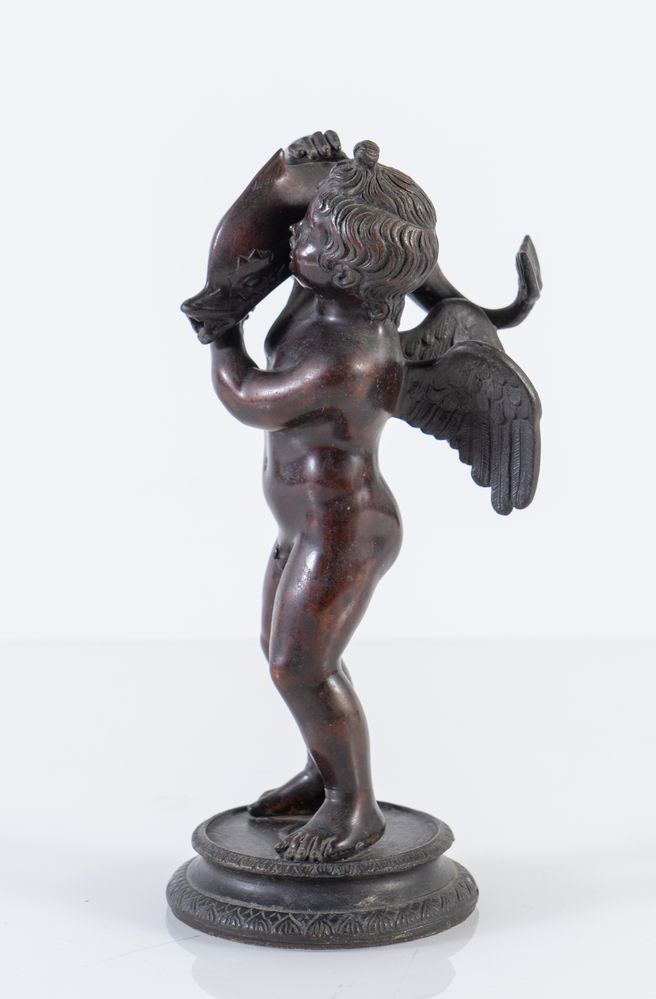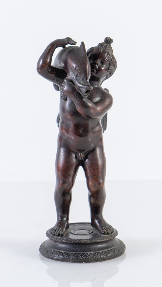 Scultura in bronzo raffigurante cherubino con delfino. Francia, inizio del XIX secolo. Cm 26x10,5x10,5.