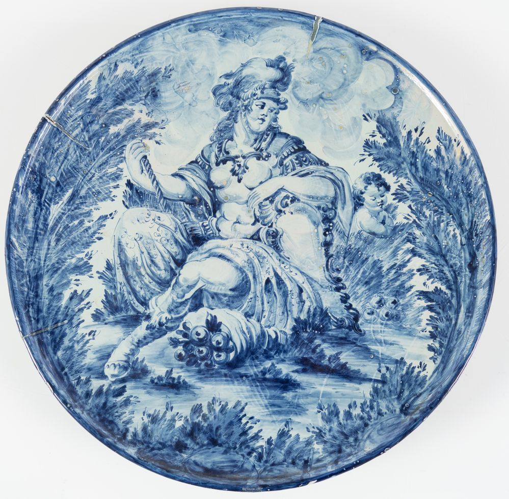 Grande piatto in maiolica decorato sui toni del blu. Inizio del XVIII secolo....